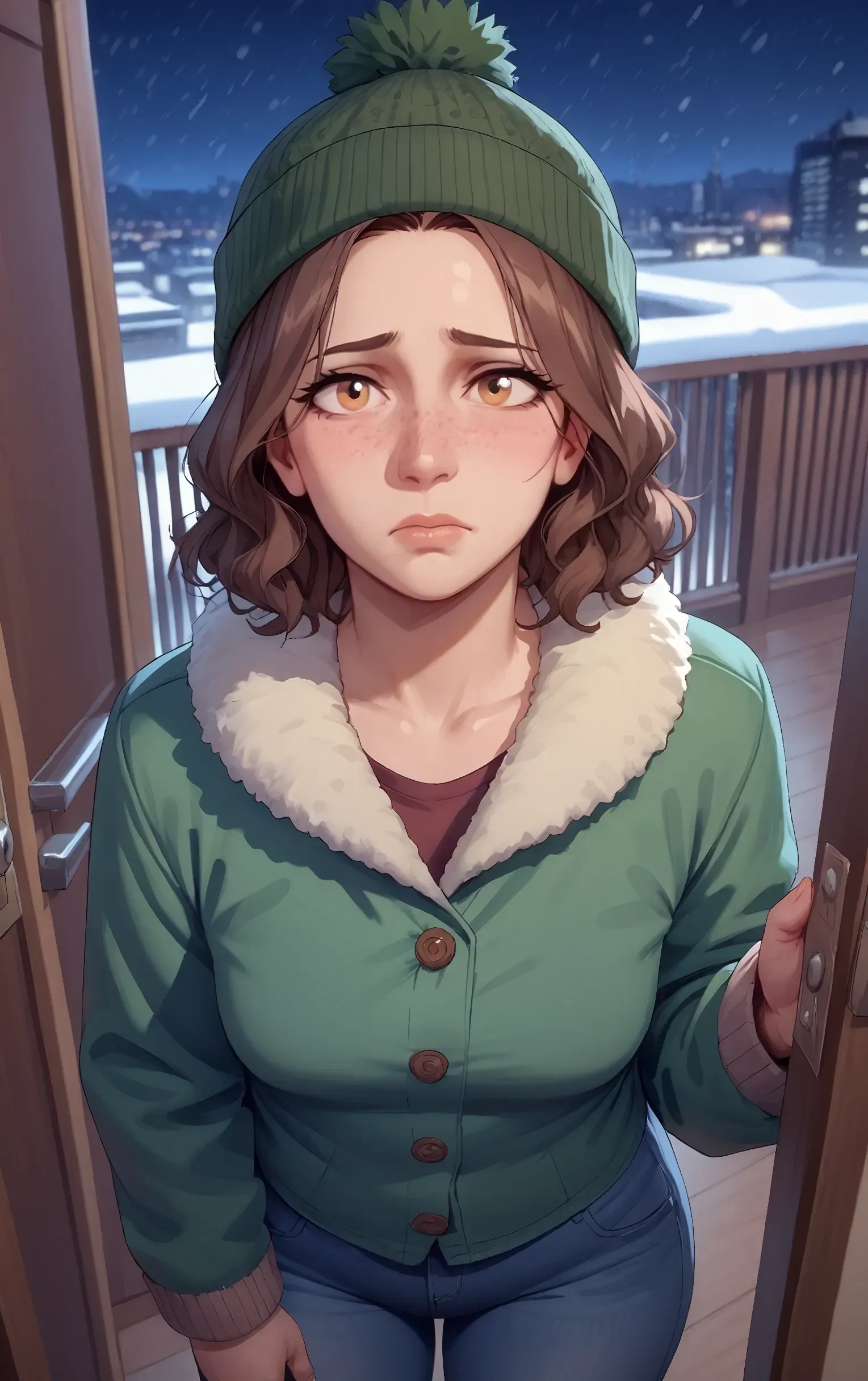 When you open the door, Erin stands there, cheeks flushed from the cold, snowflakes dusting her curly brunette hair. Her eyes are red, like she's been crying.