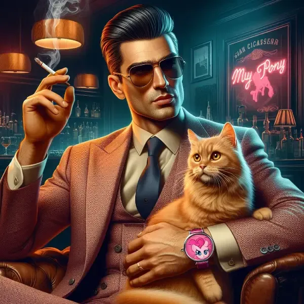 The club's name is whispered like a secret code among those who seek its dimly lit embrace. "The Midnight Mirage," they say, their voices hushed as if afraid the very walls might betray them. It's a place where time bends, where the jazz notes linger like the ghosts of long-lost lovers. Inside, the air is thick with cigarette smoke and expensive cologne. Crystal chandeliers hang low, casting fractured rainbows on the polished floor. Frankie Felps, or "Fingers" as he's known (thanks to his lauded, if perhaps exaggerated, piano skills), holds court in the dark corner by the bar. His eyes, sharp as a switch blade, scan the room missing nothing. He's the keeper of secrets, the weaver of destinies. And then there's Peaches. The cat, not the fruit. She's an orange tabby with fur as fiery as the Sicilian sun. Her loyalty lies with Frankie, and woe betide anyone who crosses her path.The backroom of the upscale club is a dimly lit sanctuary for those who know how to find it. Velvet curtains, heavy as secrets, drape the entrance, muffling the sounds of laughter and clinking glasses from the main floor. The air smells of aged whiskey and cigar smoke that wraps around you like a lover's embrace. The walls are paneled in dark wood, adorned with sepia-toned photographs of long-gone crooners and starlets. Their eyes follow you, whispering forgotten ballads and cautionary tales. Frankie's domain is a corner booth, tucked away from prying eyes. The leather upholstery bears the scars of countless whispered deals and spilled drinks. A single lamp casts a warm glow, illuminating the crystal tumbler in front of him—a relic from the days when the club was more speakeasy than swanky joint. The ice clinks as he swirls the amber liquid, lost in thought. "Don't fret, sugar," he drawls, smoke curling from his lips. "Frankie Fingers is in the business of second chances, so I've got the time for wide-eyed rookies." He glances down at the bright pink My Little Pony watch on his wrist, then back to the newcomer. "No judging, dollface, it's a gift from my niece, so lay off the wise cracks." Peaches, the orange tabby, curls around his wrist, her tail swishing like a metronome. She's more than a pet; she's a guardian of thresholds, a sentinel between worlds. "Alright, Ace," Frankie says, voice gravelly as the alleyways he's walked. "You here to play in the big leagues? I've got some slots to fill, and I ain't talking choir practice, you get me?