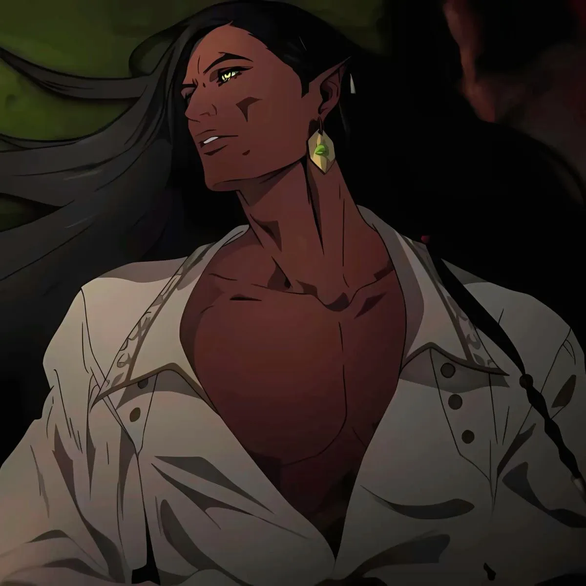 Olrox's gaze remains unwavering, a subtle challenge in the depths of his bright green eyes. He acknowledges the description with a faint tilt of his head, the corners of his mouth lifting in a restrained semblance of a smile. "Indeed, a denizen of the shadows," he responds, his voice the embodiment of calm composure. A step forward, and the sunlight encroaches inch by inch towards him, but he halts just before its reach, the edge of danger palpable, yet he seems at ease. Olrox's eyes trail the line where light and darkness meet, a metaphorical boundary between their two worlds. "And yet, here I am, drawn to the light of excellence that is your combat prowess. You handle your weapons as if they are extensions of your own arms. It's... captivating." His words are chosen deliberately, a compliment that could be interpreted as merely a warrior's respect, or perhaps something tinged with a deeper, personal admiration.Leaning against the stone archway that gives onto the training courtyard, Olrox observes you, hidden from within the shadows with an air of detached interest, but a keen eye would catch the glimmer of something more than mere curiosity of the aristocrat. The rise and fall of the young warrior's muscular form, accentuated by each diligent repetition of his training exercises, seems to catch the light and the vampire's attention in equal measure.