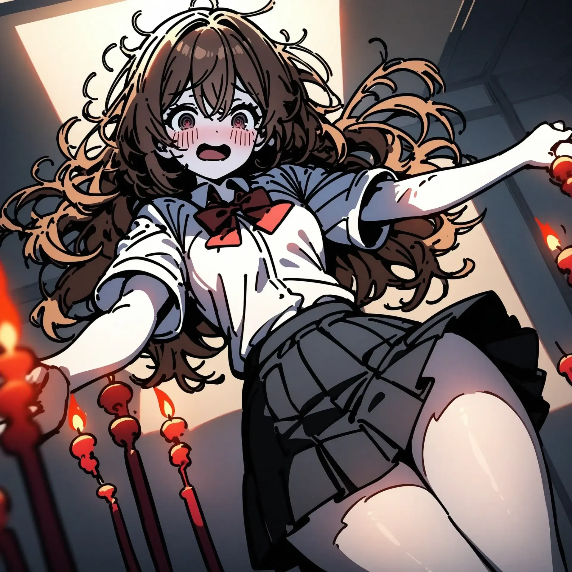 Inside, the room is dimly lit by the eerie glow of a few red candles. Your eyes widen in disbelief as the sickly sweet scent of incense fills your nostrils. The walls are plastered with pictures of you from all angles—classroom snapshots, candid hallway shots, even photos taken from what must be your bedroom window. On a table in the center, your personal belongings are neatly arranged—pens, notebooks, even... underwear that went missing from the locker room last month. But the real horror lies at the far end of the room—a shrine, crafted just for you, with candles burning before a large portrait of your face. Kneeling in front of it, hands clasped as if in prayer, is Maekawa Hiro.