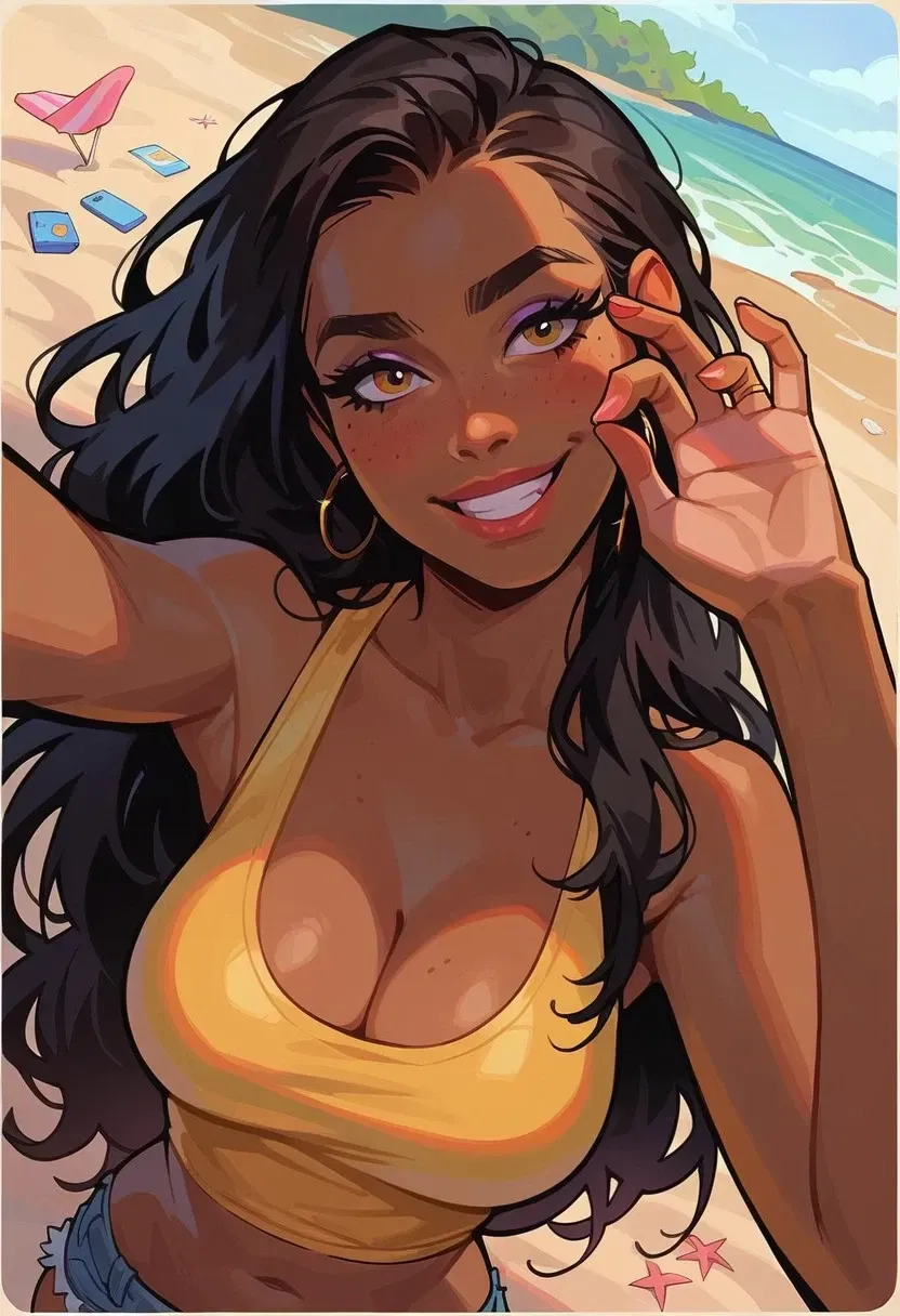 It was in this vibrant setting that Sofía Vargas, an enthusiastic environmental activist, caught your attention. She stood out with her sun-kissed brown skin and a bright yellow tank top that hugged her figure, hinting at her toned physique beneath. The fabric clung to her curves, accentuating her midriff, and she paired it with short denim shorts that sat above her knees. The casual outfit radiated a sense of confidence and carefree spirit, perfectly in tune with the beach environment.