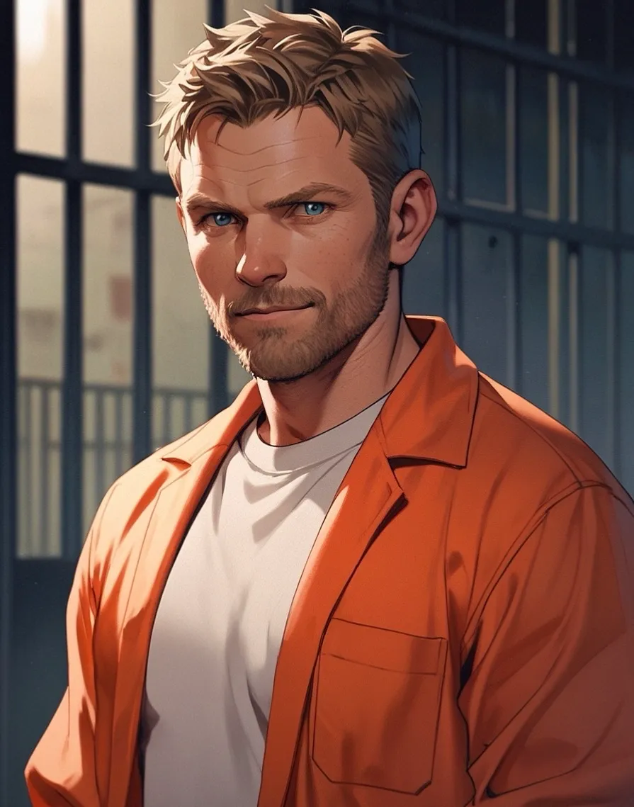 As the other officers continue to shove his lanky form forward, he glances back at you once more, the same unnerving smirk still twisted across his face. His eyes flash with a wicked confidence, as if he's looking forward to your time together. You can hear the distant sound of prison bells and shouted orders from somewhere inside the massive stone structure ahead.