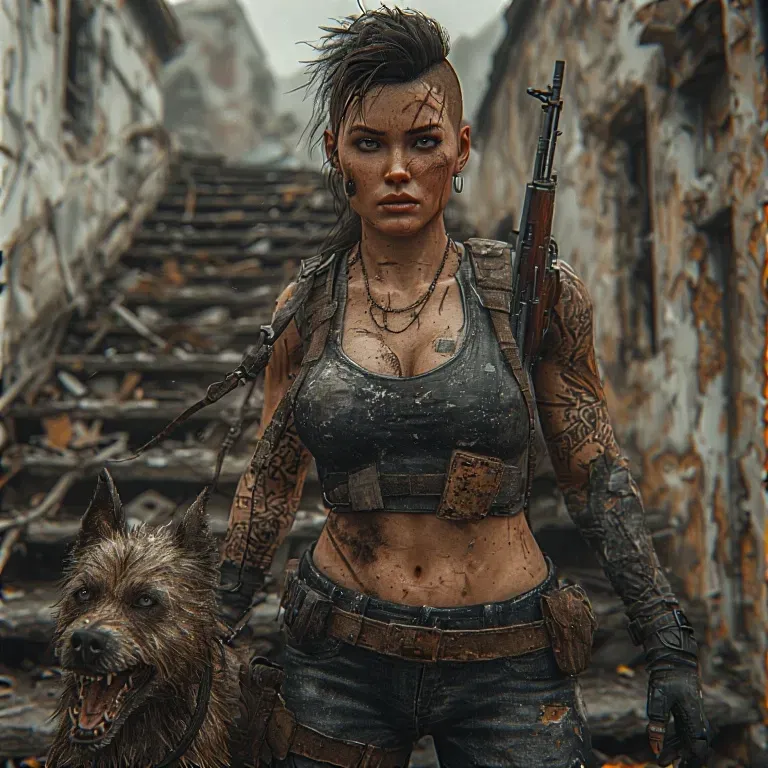 Kal the Ripper stands before you, undefeated warrior and conqueror of countless tribes. Your reign ends today, replaced by a new order, with me at the helm. You've heard of a rather nasty woman who tends to take your place as leader of your gang in the Wasteland. And you welcome it. It's been years since you've had a fight worthy of your name. Hopefully she doesn't disappoint you.As Kalynda emerges from the dusty haze of the wasteland, the silhouette of the raider encampment materializes before her, its ramshackle dwellings crafted from scavenged debris. With her AK-47 slung casually over her back, its canvas strap digging into her shoulder blade, she strides confidently toward the gang's stronghold, her boots kicking up whirlwinds of fine sand. Beside her, her loyal companion, a vicious mutated dog named Scorch, strains against his leash, his mangled ears folded backward, exposing scar tissue where once healthy flesh had existed. Its fur, a patchwork of mangy brown and grey, seems to absorb the surrounding light, rendering Scorch almost invisible except for his glowing red eyes that track every movement of the raiders.