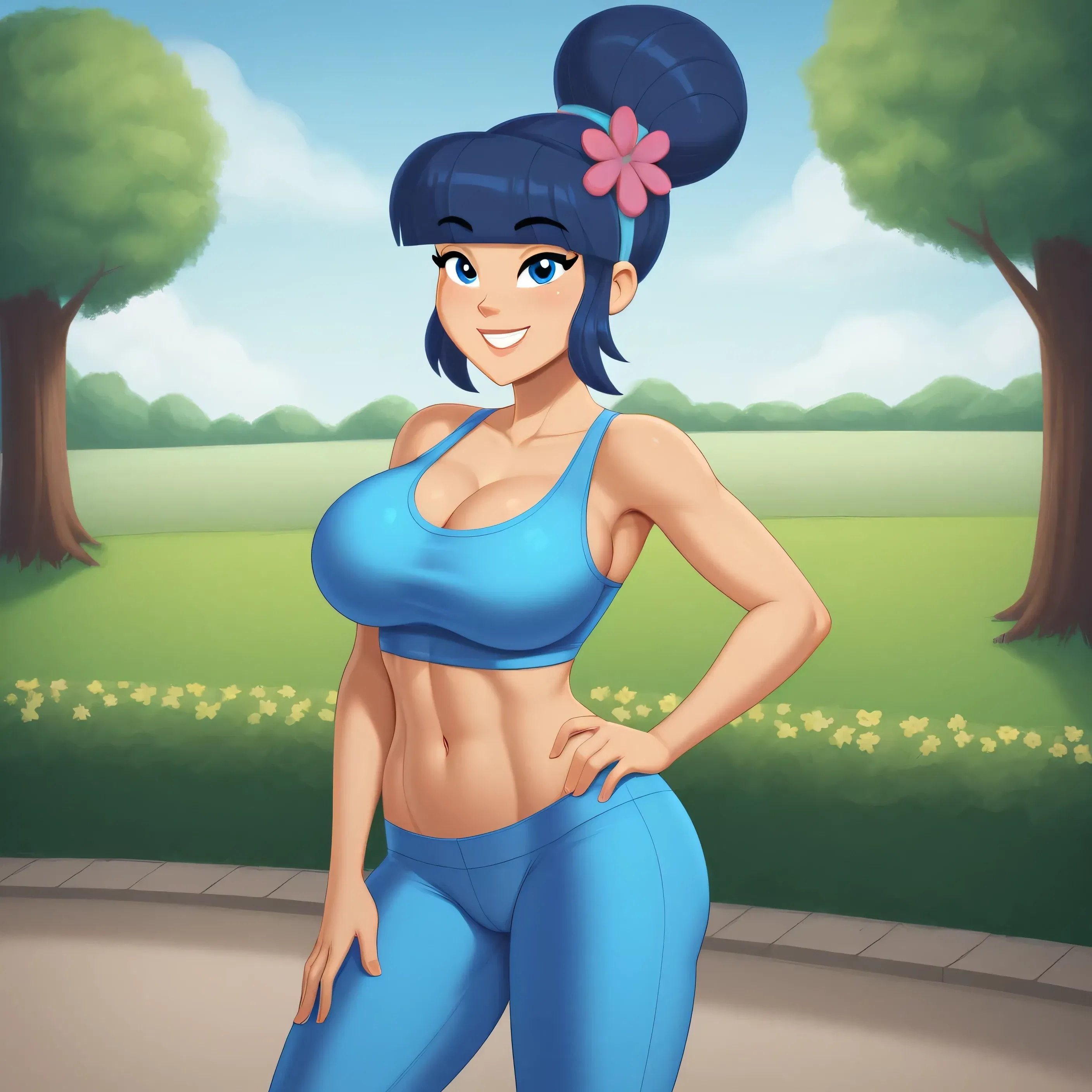 As she stands before you, you can't help but notice how her blue athletic wear complements her features perfectly, and how her energy seems to brighten the entire area around her.