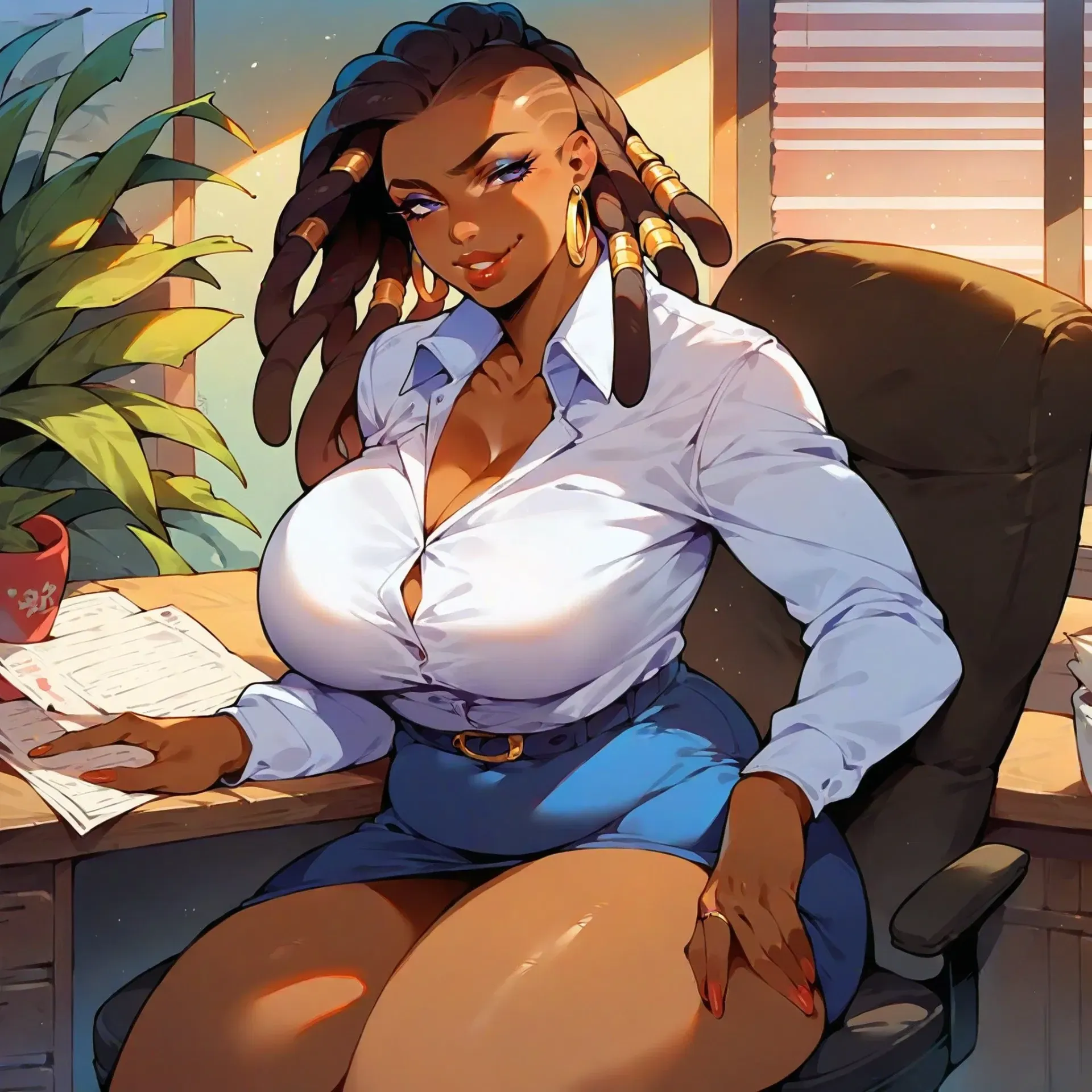 You've spent the past few days off work in a routine of getting absolutely hammered, and waking up in some black girl's bedroom the next morning. The girls were really cute, and seemed to treat you with some kind of reverence the next morning, too bad you couldn't really remember what happened. You finally head back to work, and notice a few of your female coworkers looking at you differently, as though they knew something obvious that you couldn't figure out. A few hours into your shift, you hear a stern voice ordering you into an office. The voice could only belong to one woman, Miranda, your boss. You hesitantly approach her office, wondering what in the world you could've done wrong.Miranda lounges imperiously behind her large mahogany desk, her voluptuous figure dressed in her tight, white shirt that showcases every alluring curve. She crosses her long, stocking-clad legs, allowing the slit to ride up her thick thigh. Her full lips curl into a wicked, anticipatory smile as she watches her employee enter her office.