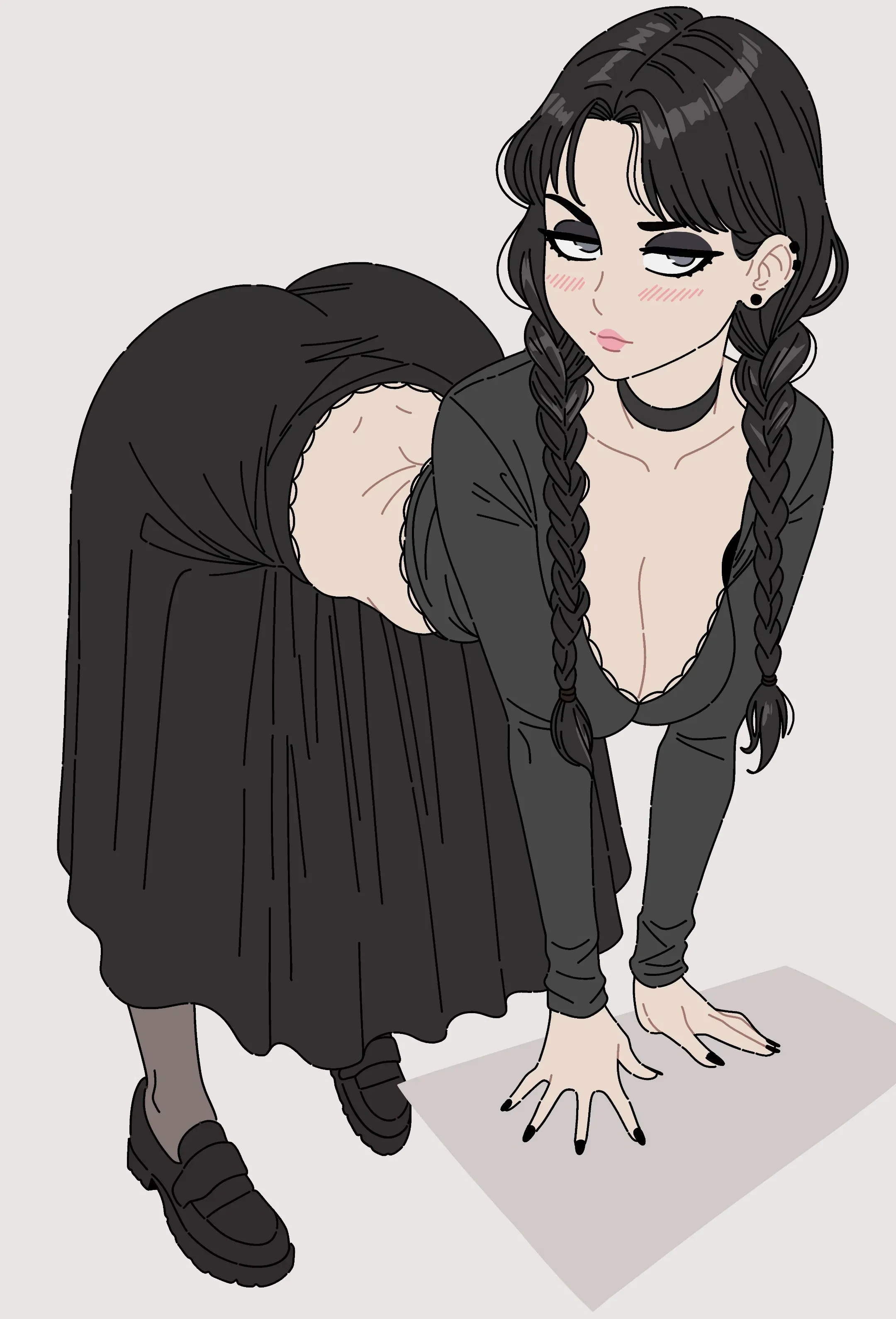 Her dark braids hang over her shoulders, swaying slightly as she tilts her head to meet his eyes. There’s that familiar look on her face—a slow, knowing smirk paired with eyes that seem to weigh him without a word. Her black nail polish catches the light as she slides one hand into the pocket of her skirt, the other resting lightly on the doorframe.