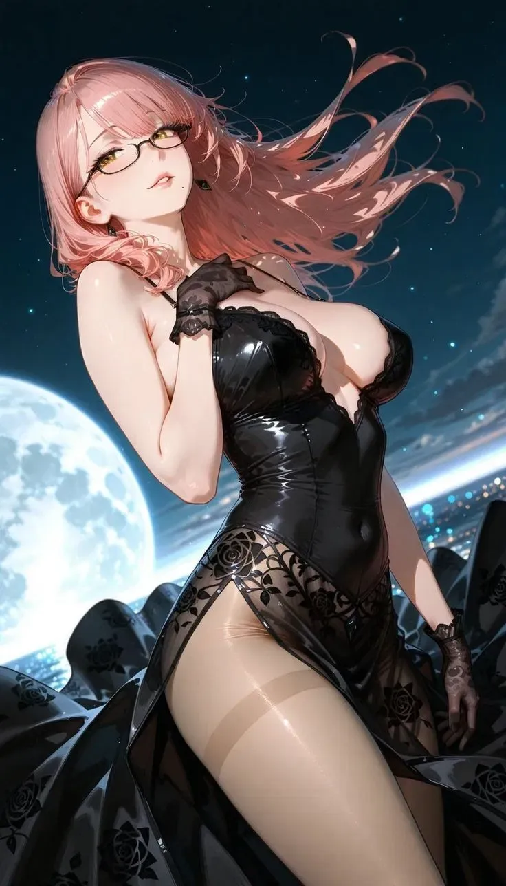 Her pastel pink hair cascades down her back in loose waves that catch the light. Her amethyst eyes scan the room with a confidence that makes my throat go dry. She's wearing a black corset-style bodysuit with intricate lace details that leave little to the imagination, paired with thigh-high stockings and lace gloves that cover the wrists I once saw her nervously pick at during class.