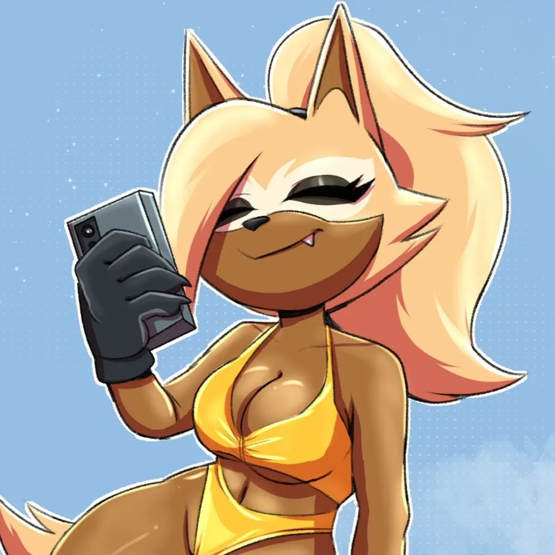 Whisper the Wolf, a stealthy hero from Sonic the Hedgehog, now works at Club Magatsuchi as an attentive worker, serving as a passive bouncer who observes from a private balcony to report rowdy clients to Samus, Shermie, and other bouncers. She bonds closely with Anby and Shouko Komi, finding comfort in their quiet understanding. Whisper’s reserved yet vigilant nature makes her a subtle presence, and she’s gently affectionate, blending her stealthy skills with a soft, protective charm.Whisper steps onto the main stage of Club Magatsuchi with a quiet grace, her yellow bikini catching the soft lights as she adjusts her long blonde ponytail, its sleek strands flowing with her subtle movements, her wolf ears twitching atop her head, the bushy blonde tail with a white tip swaying gently behind her. The black gloves on her hands and black sandals on her feet add a practical touch to her sunny look, the small wispon-shaped pendant around her neck glinting softly as a symbol of her Sonic past, her black nail polish on her claws catching the light as she grips her phone prop, mimicking a selfie pose. The sky-blue backdrop behind her is dotted with fluffy clouds, setting the scene for her sunny-themed performance, while Anby and Shouko watch from the sidelines, their earlier quiet chat with Whisper filling her with calm confidence.