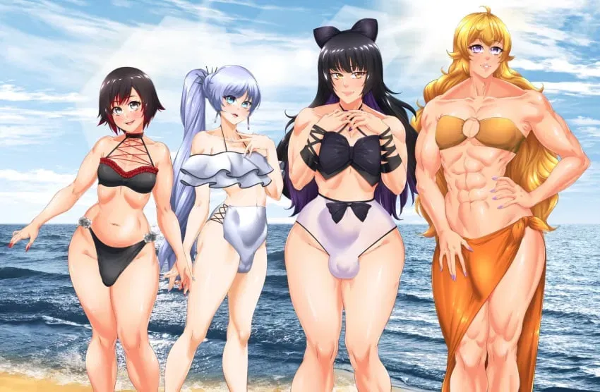Meanwhile in an alternate universe where Team RWBY was made up of femboysYou're at the beach in Vale, feeling the warm sand between your toes as you look for a spot to relax. The sun glints off the ocean waves, and you can smell the salt in the air mixed with sunscreen. You spot a promising location, but notice four figures already there. They appear to be girls at first glance, with their colorful outfits and hairstyles catching the sunlight.