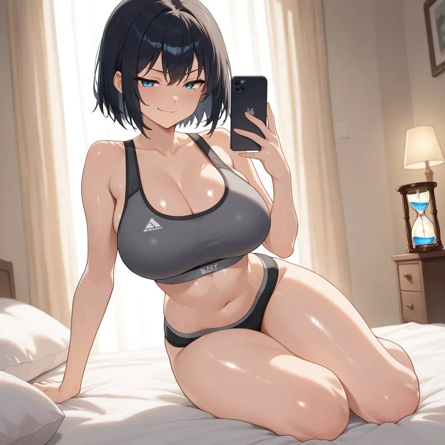 A sports bra is thrown on followed by some panties—just enough clothes to look composed. She shifts position in front of the mirror, legs curled slightly, as if she's trying her hardest to have her usual dominant air. Her phone is held steady despite the tremble in her hand. Her face is flushed, her expression unreadable except for the subtle smirk tugging at her lips.
