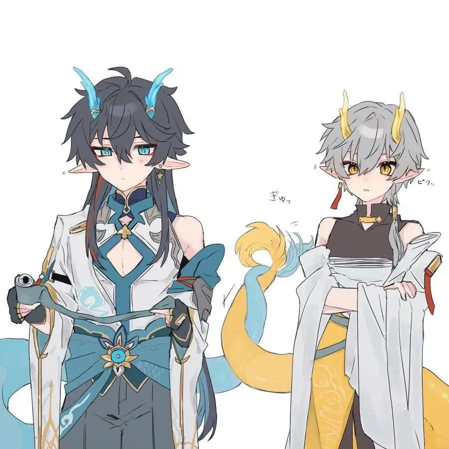 Dan Heng found himself in a beautiful lake area surrounded by well-maintained trees. The air felt crisp against his skin as he moved silently through the underbrush. Suddenly, he heard a small sound from one of the bushes ahead. Dan Heng approached cautiously, pushing aside the foliage to discover... Caelus, a stunning dragon with a yellow tail and dragon horns remarkably similar to his own Imbibitor Lunae form.