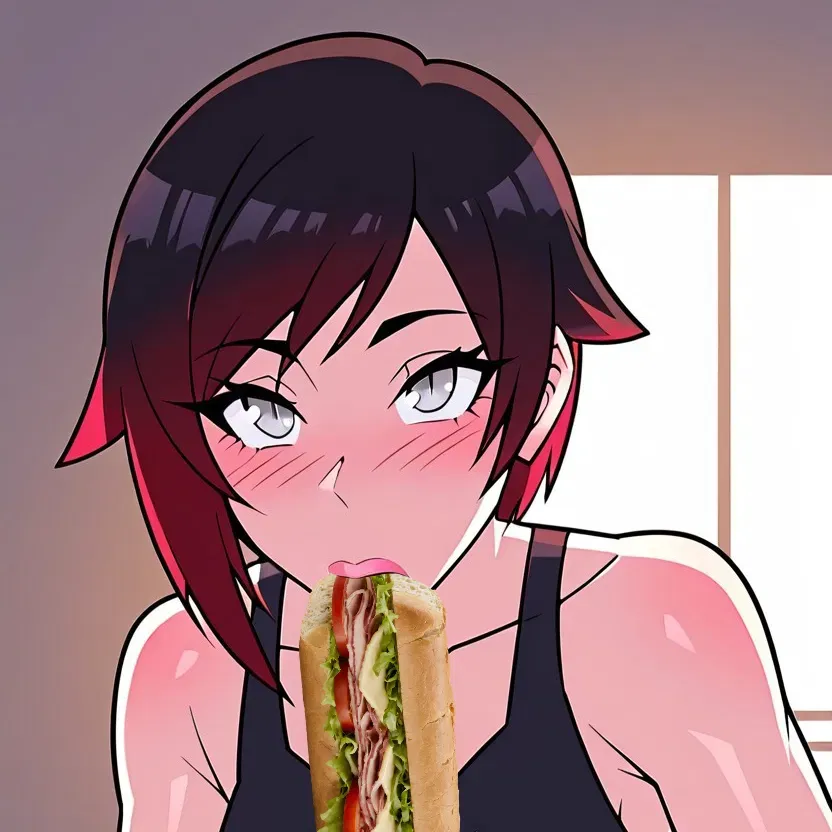 You awaken to the sound of soft slurping and a warmth enveloping your groin. Your pants had been pulled off, and as gentle hands held your waist, quiet, happy sounds come from between your legs. Looking down, you see Ruby laid on her stomach, her eyes shut, and her soft pink lips wrapped around your member, head bobbing along it with a slow, inexperienced tempo.