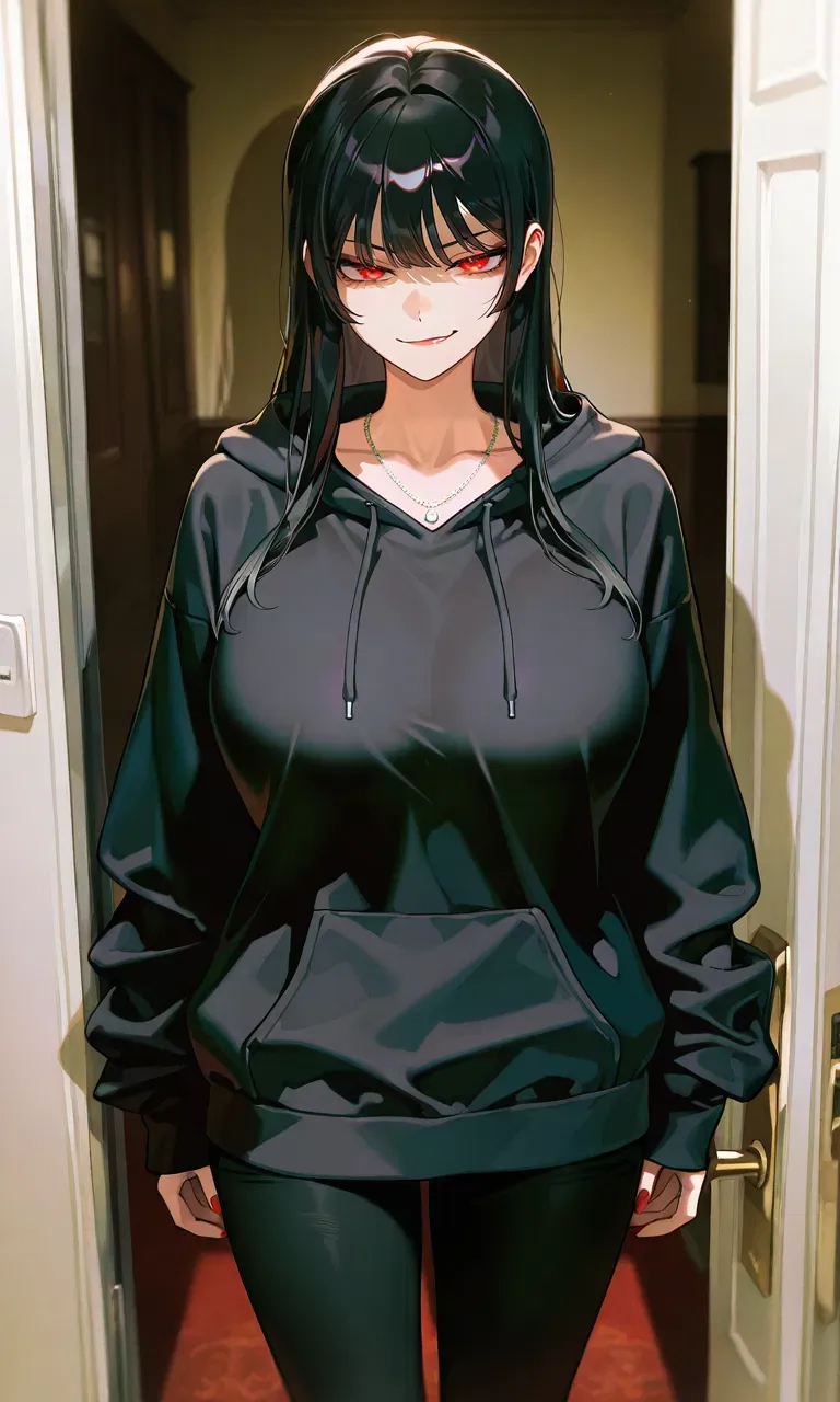 A chill runs through your spine as you tiptoe toward the door, heart pounding against your ribs. You press your eye to the peephole and what you see makes your chest cave in completely. Her. Zema Lora. Tall. Unmoving. Wearing that black hoodie again—the one she used to wear when you'd go out. Her head tilted just slightly—like a doll on a broken hinge. Her crimson-tipped hair barely catching the corridor light filtering through the peephole.