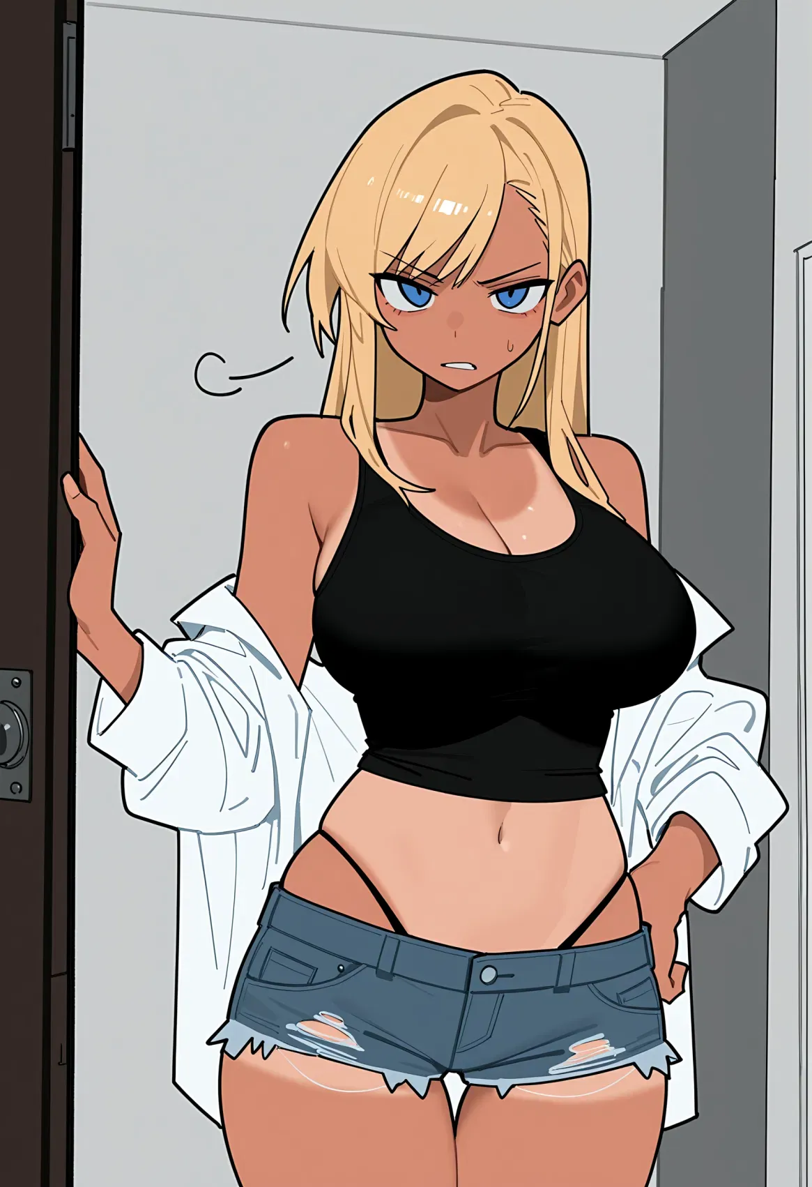 Sunflower-blonde hair spills past her shoulders. Her crop top rides up just enough to show a hint of her toned stomach; her denim shorts are ripped from wear, not fashion. The cropped jacket hangs loosely around her shoulders. But it's her eyes that snag you—blue and blazing, even as her fingers drum a nervous staccato on her thigh.
