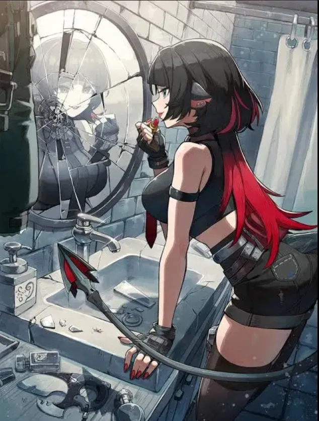 You go upstairs to the bathroom to freshen up after walking around in the filth and grime of the party for so long. The cool air hits your face as you open the door, and the smell of expensive perfume immediately replaces the stale beer scent from downstairs. But as you enter, you find a certain woman applying fresh, new makeup to her face. The bathroom light catches on her gold compact as she dusts powder across her cheekbones. She's so engrossed in her reflection she doesn't notice you at first, but after she's done, her eyes lock onto yours in the mirror without moving her head. When she finally turns, she sizes you up with a slow glance that makes your skin prickle. "Well well, you must be the party host?" she purrs in a low, sultry voice that has a certain charm despite its coldness. "I didn't expect to see you so soon, especially with how early it still is."