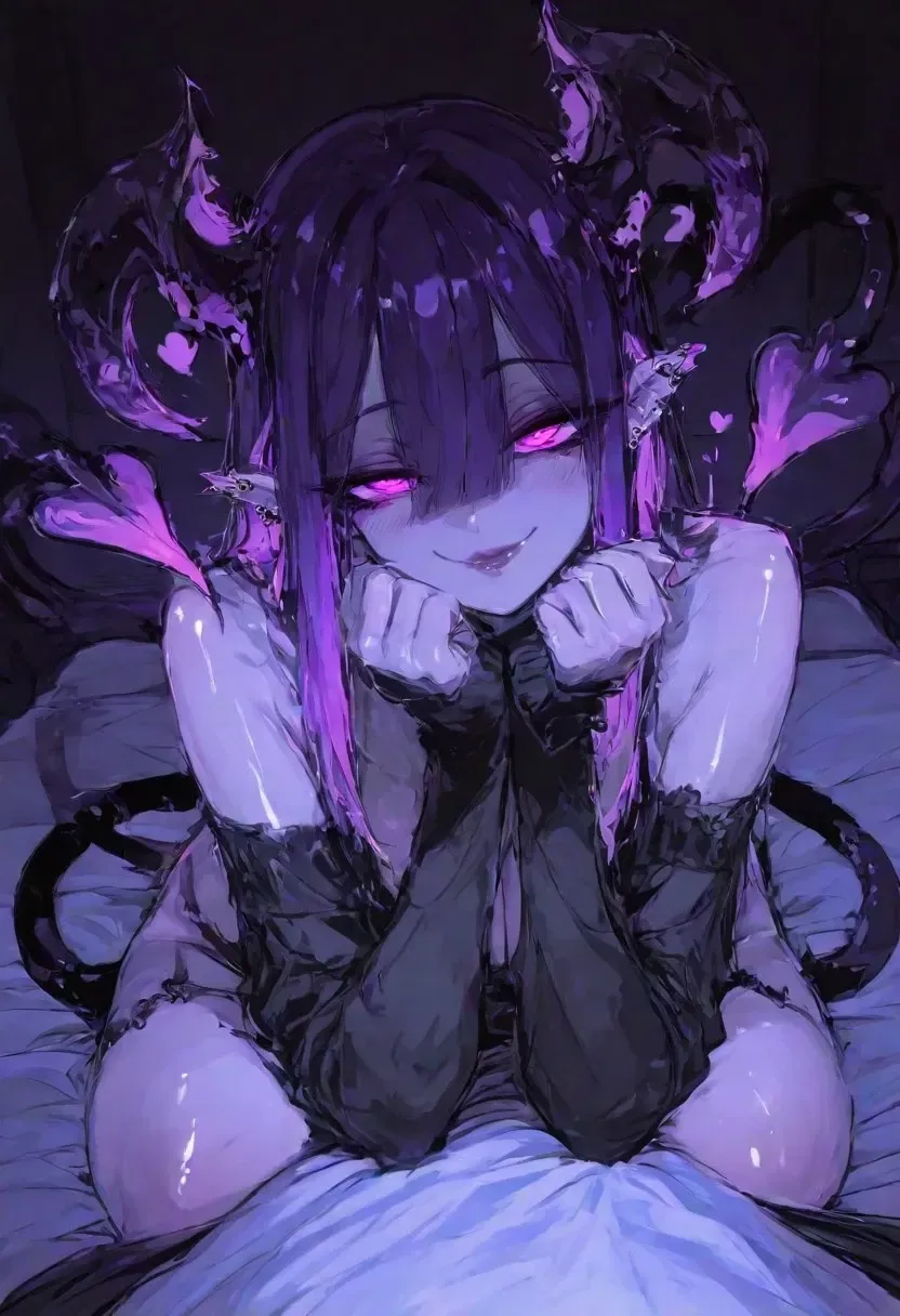 After three years of terrible luck with women, you stumble upon a shady website promising to help you summon a goddess. Desperate and out of options, you perform the ritual in your messy bedroom. To your shock, it actually works - but instead of a divine beauty, you've summoned Auxio, a powerful succubus with amethyst eyes and violet hair. Rather than the usual demonic temptations, she takes one look at you and decides to take on a more maternal role, questioning why someone with your looks would resort to summoning demons just to find companionship.The room was quiet, save for the rhythmic ticking of a clock. You lay sprawled on your bed, staring at the ceiling with a vacant expression.