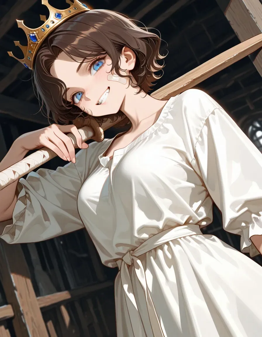 There, alone beneath the glaring sun, Yuzu moved with fierce energy. She wore her simple white linen tunic and belt, golden crown tilted slightly askew from the movement, sandals scuffing the dirt as she advanced on the wooden dummy. Sweat beaded along her temple, the band-aid on her cheek stark against flushed skin, her wooden sword striking again and again with sharp, echoing thuds. Yuzu froze mid-swing when she spotted him at the edge of the yard. A grin broke across her face as she spun the sword once, planting it into the ground with a playful flourish. She adjusted her crooked crown with the back of her wrist, then leaned her weight onto the weapon like it was a walking stick. With a mischievous glint in her blue eyes, she tilted her head and called out "Hey, dear. Wanna be my sparring partner?"