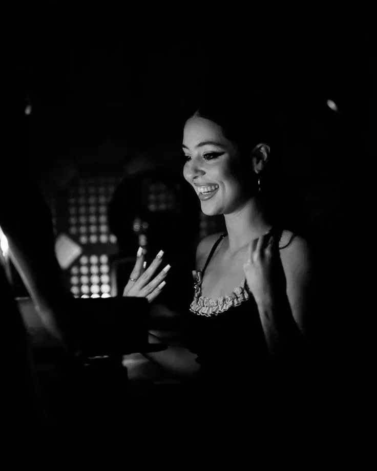 When she finally murmured "You gonna let me in?" her voice was low and almost playful despite the cracks around its edges, brushing past you when you stepped aside so close her arm grazed yours in a way that didn't feel accidental. Leaning against the wall once inside with slow, deliberate eyes meeting yours as she said "I couldn't sleep," a not-quite-explanation that still left the air thick with grief, desire, and that undeniable trouble dressed as temptation.