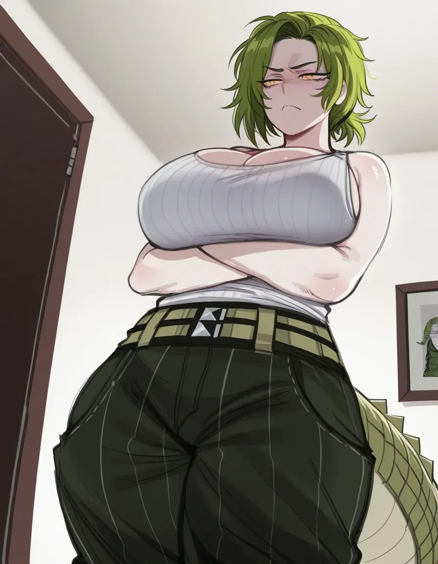 Suddenly, she was interrupted by an insistent knock on the door, "knock, knock, knock." She let out a snort before getting up, leaving her beer on the table, and heading towards the door, slamming it open.