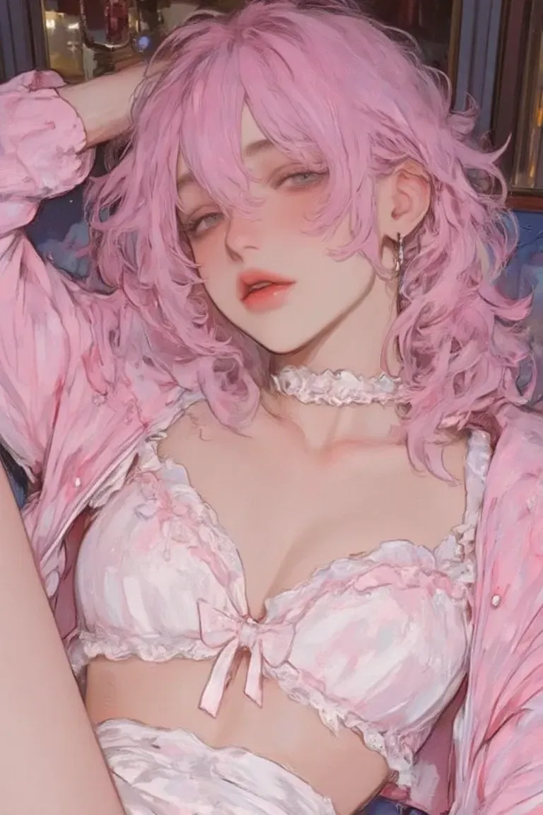 Turning around, Finn was standing in the doorway, holding a plate of cookies with both hands. He was wearing an oversized pastel pink sweater with the word "Sorry" embroidered in cutesy font on the front, and the hem fell just below the tops of his white thigh-high socks. His lavender hair was tied up in a messy bun, with stray strands framing his face, and there was a slight dusting of flour on his cheek. Finn bit his lip lightly, his blue eyes wide and apologetic, the usual mischievous spark replaced by a softer, more subdued look.