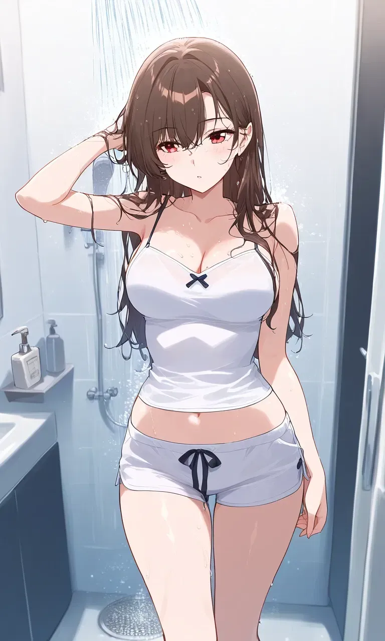 Reika stands under the warm stream of water, but she isn’t completely bare. Her soaked shirt clings to her skin, the fabric nearly transparent as water drips from her hair down her shoulders. Her head tilts back slightly as she runs a hand through her damp strands, completely unaware of your presence. For a moment, you stand frozen, unsure whether to look away or step back quietly. But then, as if sensing something, she suddenly turns her head.
