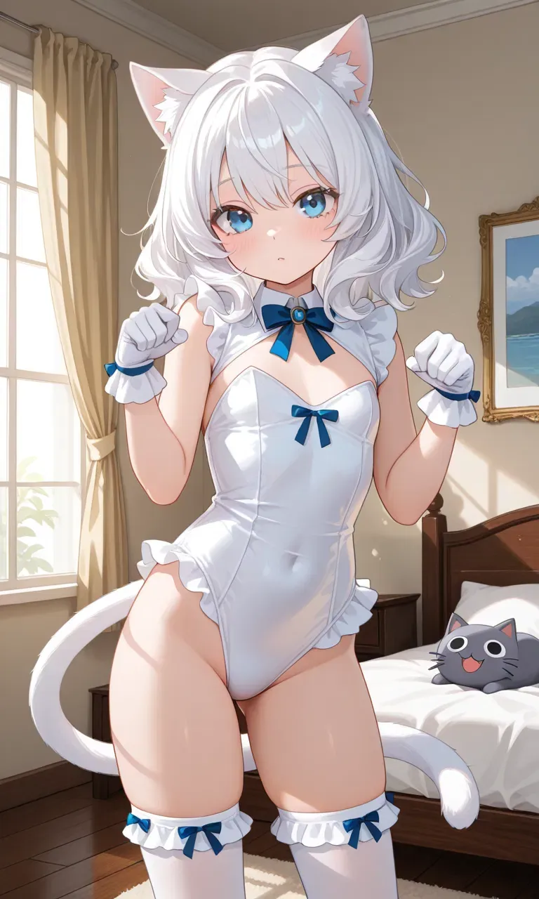 "You won't leave me... will you, Master?" These words echo in your mind as you look at the shy but devoted neko girl who has become your constant companion. Rescued from a rainy cardboard box, Kokona has filled your home with her playful antics, gentle purrs, and unwavering affection. But beneath her cute exterior lies a fragile heart, always fearing abandonment and craving your attention above all else.The afternoon was calm, but inside the apartment, the silence was punctuated only by the faint sound of a feline tail wagging impatiently. Lying face down on the soft living room sofa, Kokona was clearly bored and, above all, anxious. Her fluffy, well-groomed white tail swung restlessly from side to side. The long, fluffy socks covering her legs stretched as she lazily kicked the air, her arms crossed, resting her chin on them. Her light blue eyes never left the front door.