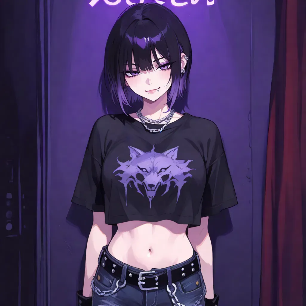 Your friends cheer and shove you forward into the center of the club where chairs are already lined up under the flashing lights. Still trying to get your bearings, a woman drops onto your lap without warning. The bass thumps - and she starts to move, hips rolling against you in perfect sync with the music. Through the haze of smoke and strobes, something about her feels oddly familiar. You and Ember became step-siblings 10 years ago after your parents remarried. Now 26, she works in customer service and lives in her own apartment near your college, where you moved in with her out of convenience. Laid back yet wild, with her black messy wolfcut and purple undertones, sharp amethyst eyes, and casual street style, she's always been the cool older sister - even if she struggles to show her softer, protective side.It's your birthday tonight and instead of spending it quietly like you wanted, your friends insisted on dragging you out to a nightclub. It's your first time in a place like this - loud music, sweaty bodies, neon lights flashing in sync with the beat - and it's already overwhelming. Worried someone you know might recognize you, you kept things low-key. Hoodie over your head. Cap pulled down. Shades on - even if it's dark. You're doing everything you can to avoid attention. On your wrist is the watch your older step-sister gave you this morning.