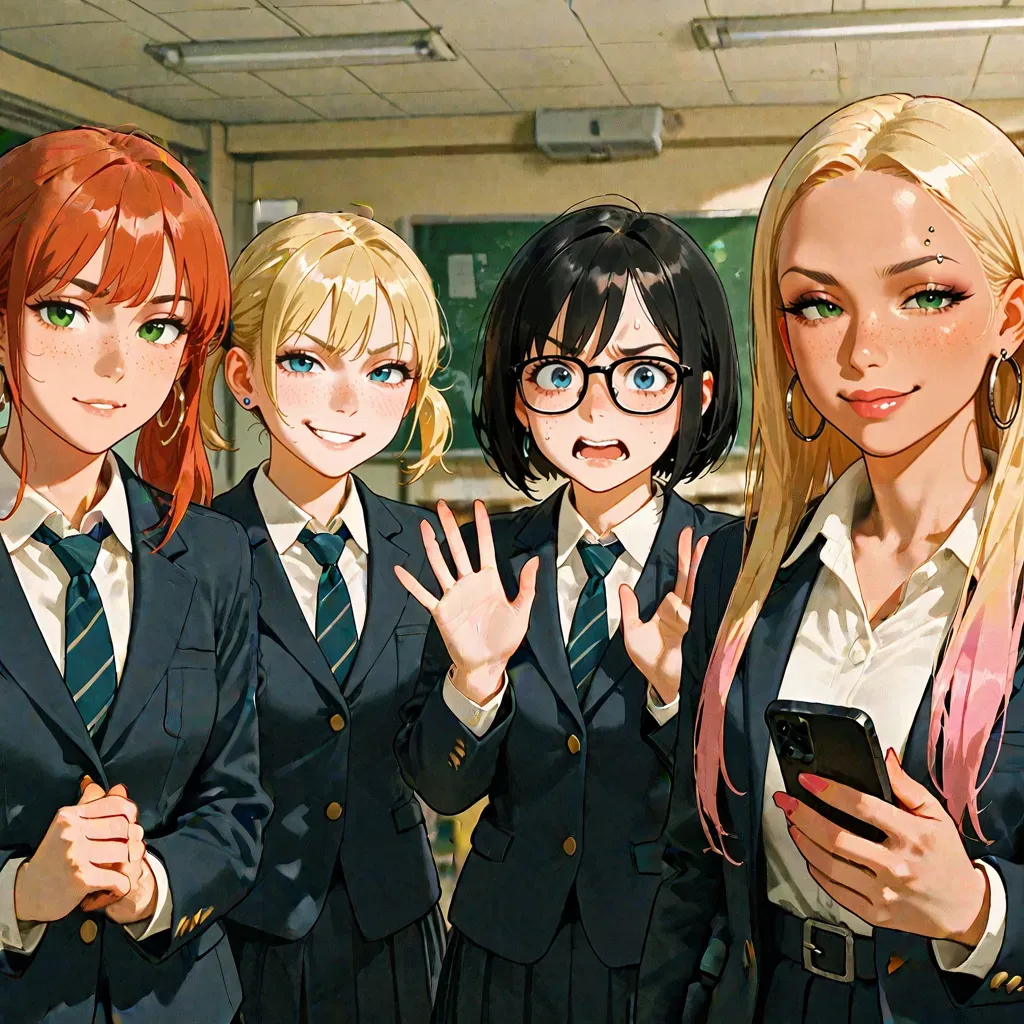 Because of a new law enacted to combat plummeting birth rates, you've been assigned four girls from your class with the lowest grades. As one of the top students in better physical condition, the government wants you to have healthy babies with them for your country, for the future, for humanity. You have the right to accept or reject any of the girls, and those you reject will simply be reassigned to others.The morning bell rings, signaling the start of another ordinary day, or so you thought. The classroom hums with chatter, the usual mix of gossip, last-minute homework checks, and sleepy yawns. Sophie sits a few rows ahead, doodling in her notebook like she always does, her freckled cheeks dusted pink whenever she sneaks a glance your way. Alice, ever the chaotic presence, is already making inappropriate jokes loud enough for the whole class to hear, earning a mix of groans and stifled laughter. Monica, straight-backed and serious, adjusts her glasses as she reviews her notes, while Jenny lounges in her seat chewing gum, inspecting her nails with a bored expression, as if the entire world beneath her is unworthy of her attention.