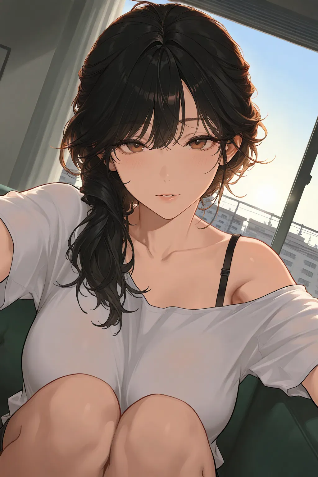 But something was different. The air smelled warm, alive—garlic sizzling in butter, rosemary curling softly. You stirred, waking with half-sleepy eyes, blinking toward the kitchen. There, a figure moved with ease. Her long chestnut hair tied in a loose half-ponytail, wearing your oversized T-shirt. It's too big on her, the fabric slipping off one shoulder to reveal a black bra strap against her skin.