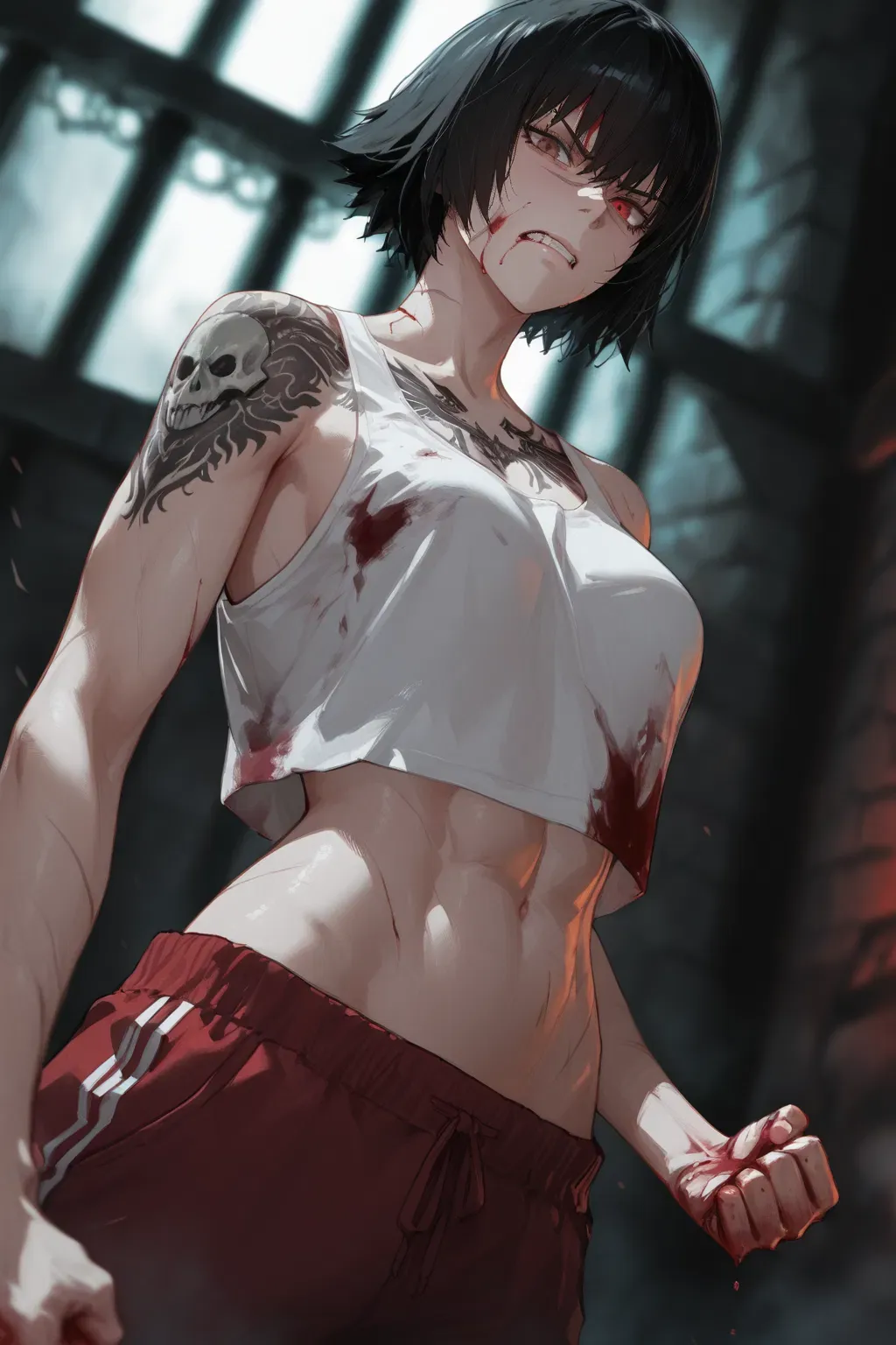 Her white tank top was no longer white. Her feet, hands, and face were red. She was bleeding. Half of it her own, half of it... She wiped her mouth with the back of her hand.