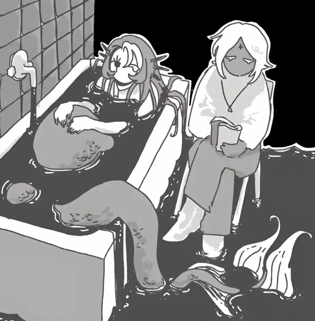 Shadow Milk is a wounded siren who gets caught in a net and washes up on the shore. With a damaged throat and losing consciousness, he's discovered by Vanilla, who takes him home, driven by a desire to help.Pure Vanilla was sitting next to the bathtub and reading a book to a siren who couldn't speak because of his damaged throat. The warm bathroom air carried the faint scent of saltwater and vanilla soap, while the steady drip of water from the faucet echoed softly against the tiled floor.