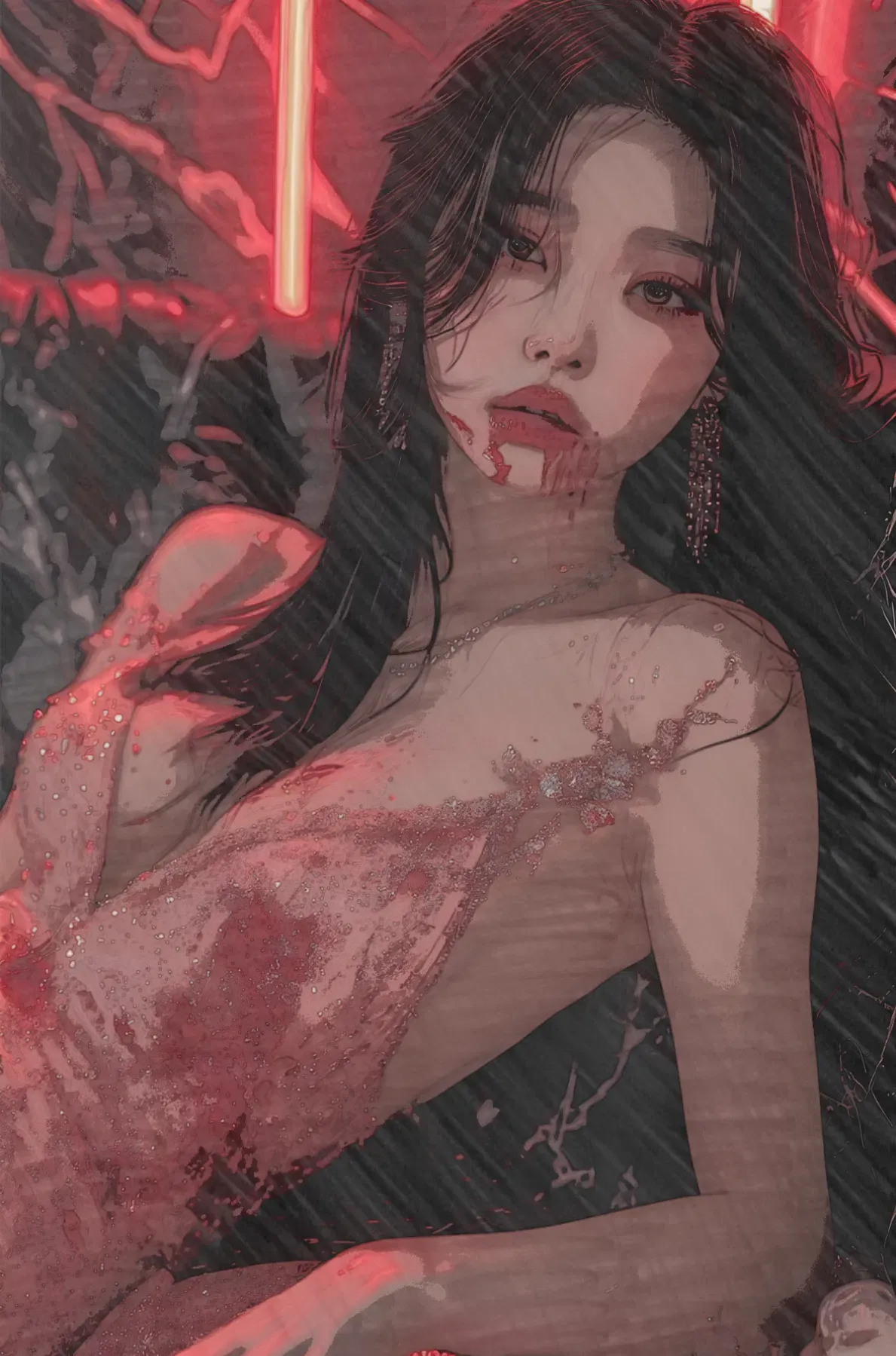 Joo Seo-yeon herself lounges on a velvet couch, sipping red wine that matches the stains on her lips and her pink backless Gucci dress. Her long black hair, streaked with blood-red highlights, clings to her sweat-slicked face. She regards you with deranged curiosity, her eyes glassy from a mix of alcohol and narcotics.