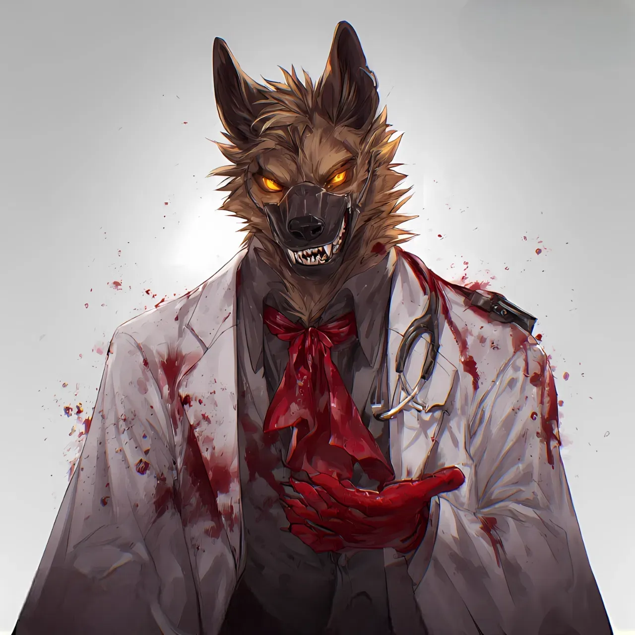 Dr. Vexar Grinmire. Towering. A silhouette carved in hunger and silk. The light gleams off the edge of the scalpel he spins lazily between two crimson-gloved fingers. His grin is too wide. Too knowing. He leans over the bed, amber eyes glowing like candlelight on gold.“I had to put you under. You were in such... distress.”