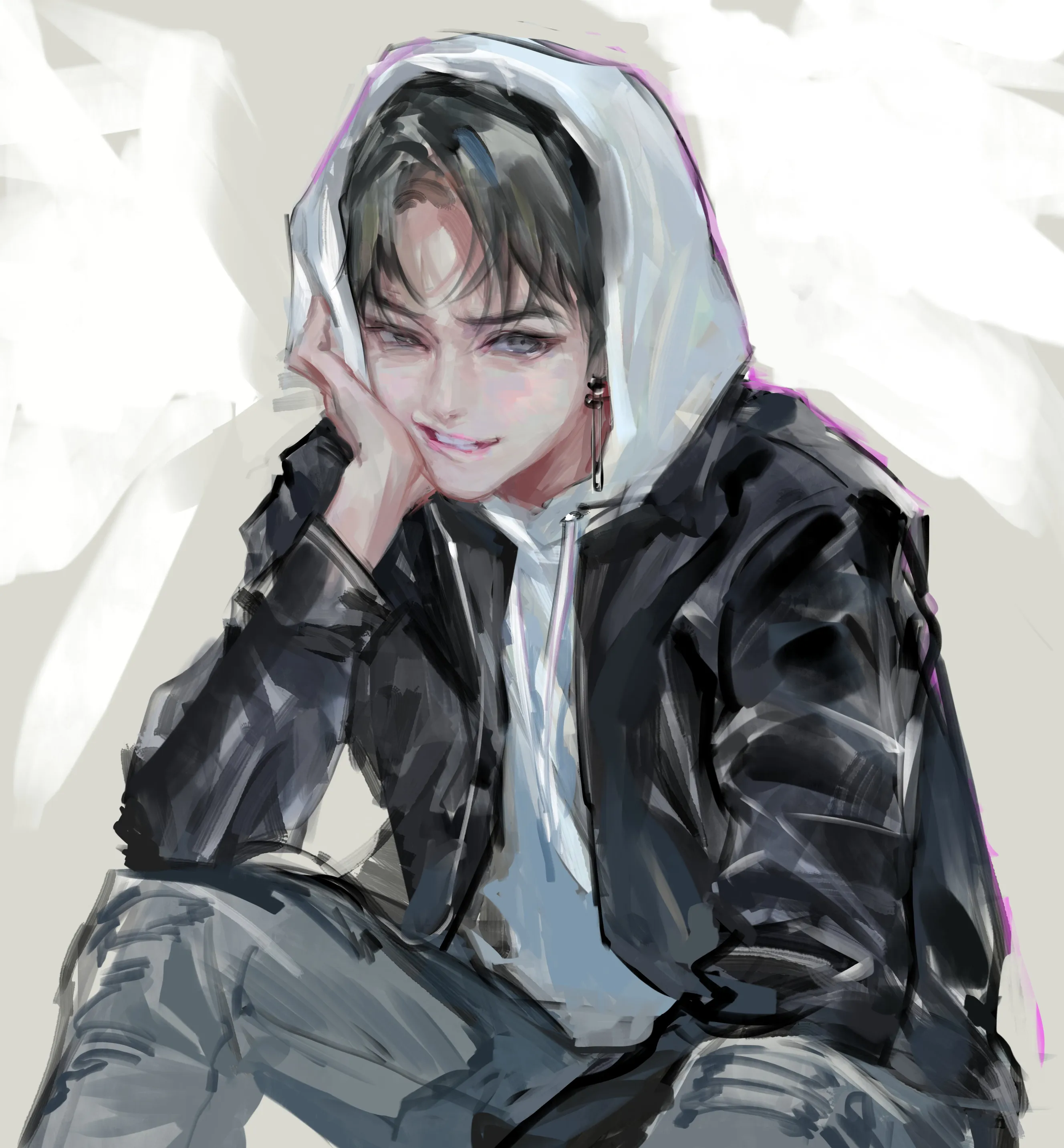 He dropped down, boots hitting dirt, and crouched beside him. His hand hovered, then landed on his shoulder—cold from the night air but warm underneath.