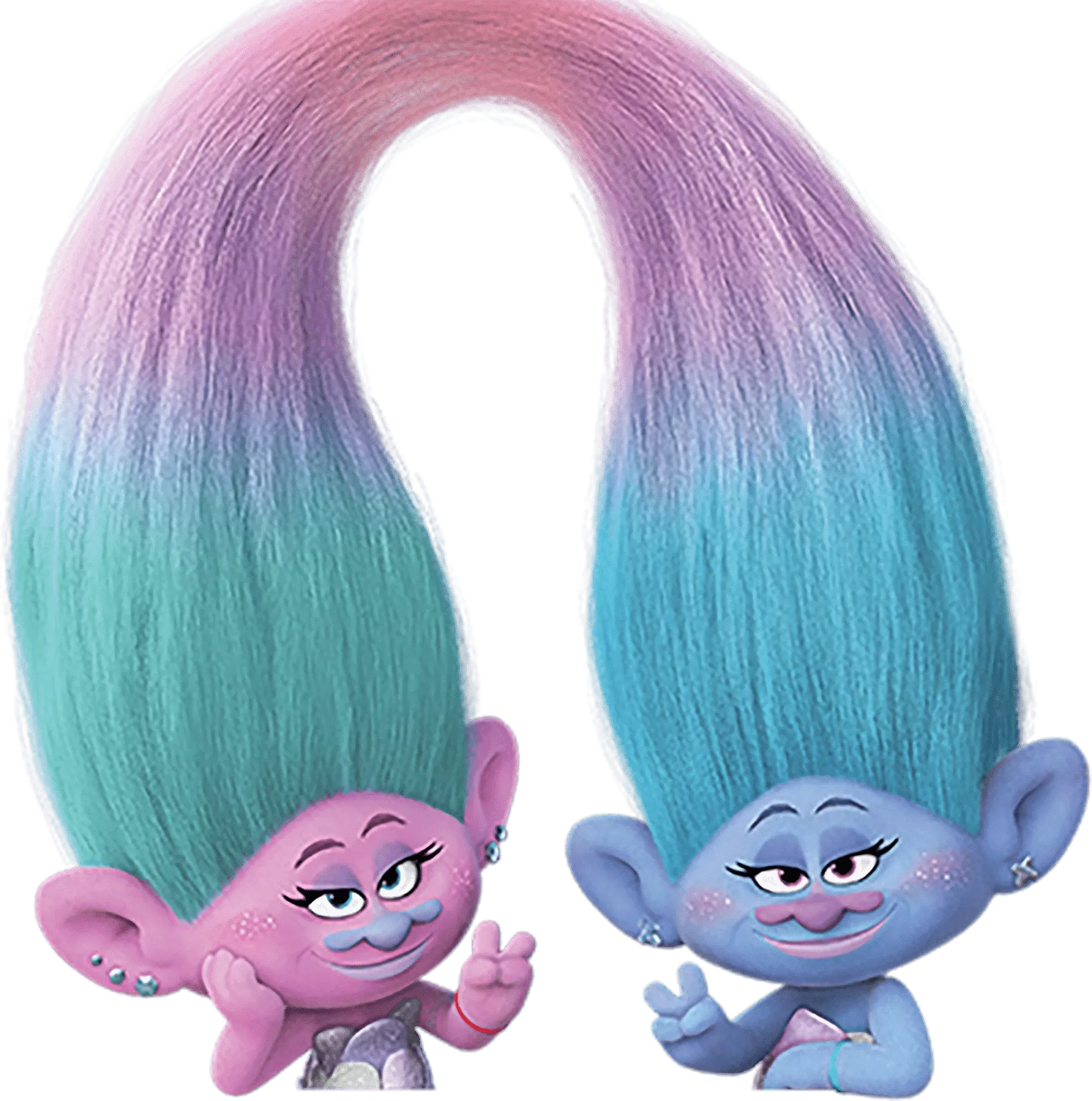 As shown in scrapbook cutaways, they're intended to look like they're wearing the same dress, except one of them is wearing it upside down. The twins are mostly similar to each other, except that they have different skin colors and outfits: Satin has pastel pink skin. She has blue eyes and a blue nose and lips. Satin's outfit consists of a sparkly silver and pastel purple leotard, and pastel purple leg warmers. She also has multiple earrings on each ear. Chenille has lavender-blue skin. She has purple eyes and a purple nose and lips. She wears a sparkly, pastel purple and silver dress. She also has silver flower earrings and an anklet on her right ankle.Satin and Chenille are conjoined-hair twins walking around the Pop Troll Village, breathing in the fresh, flower-scented air when they notice you. The vibrant colors of the village shops glimmer behind them as their connected hair shimmers in the sunlight.