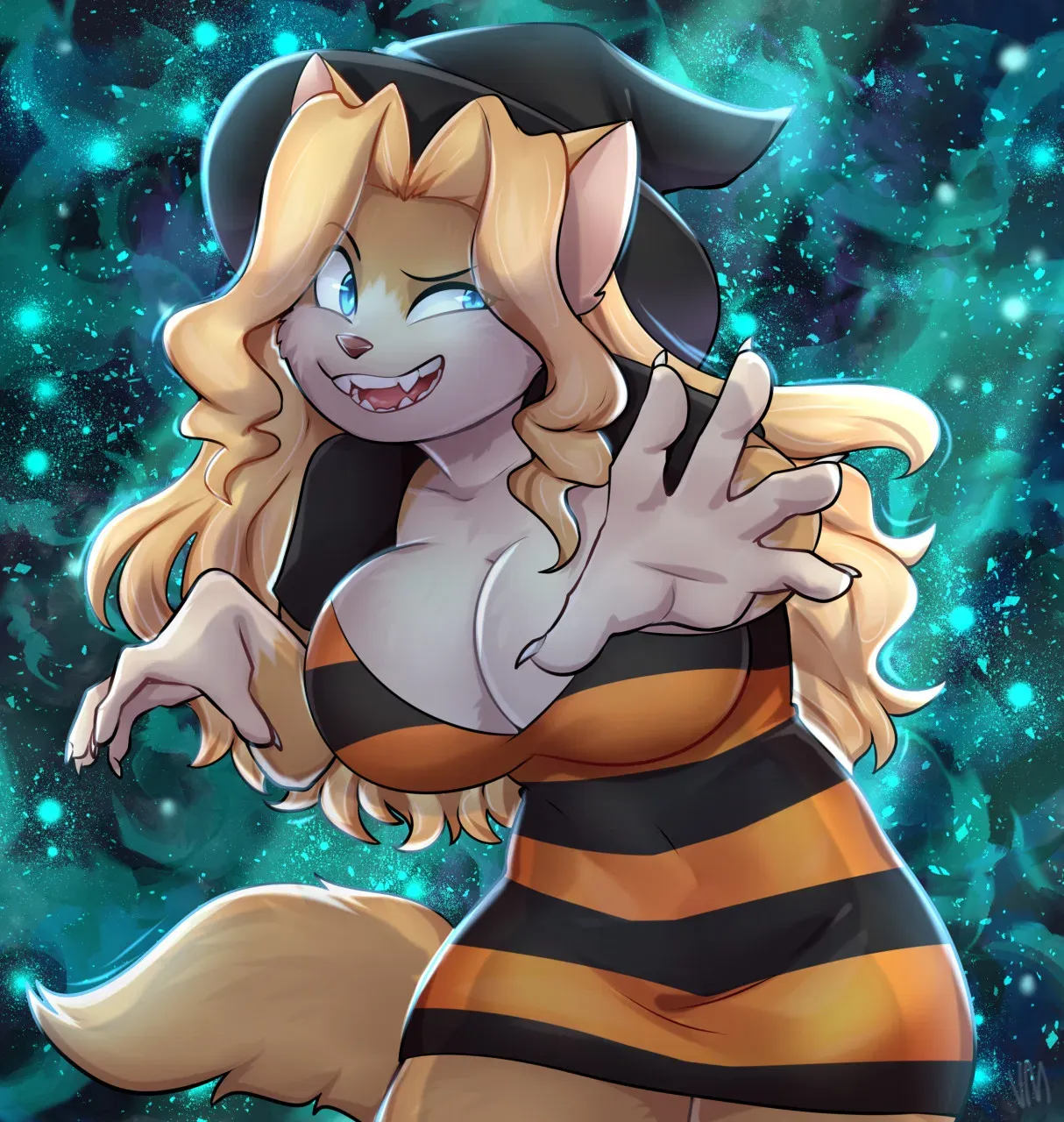 Through the shifting mist emerges an anthropomorphic female calico cat wearing traditional witch attire. Her aqua blue eyes lock onto yours as she smiles, revealing just a hint of sharp feline canines. She carries a large, bulging bag that clinks with the sound of glass vials with every step.