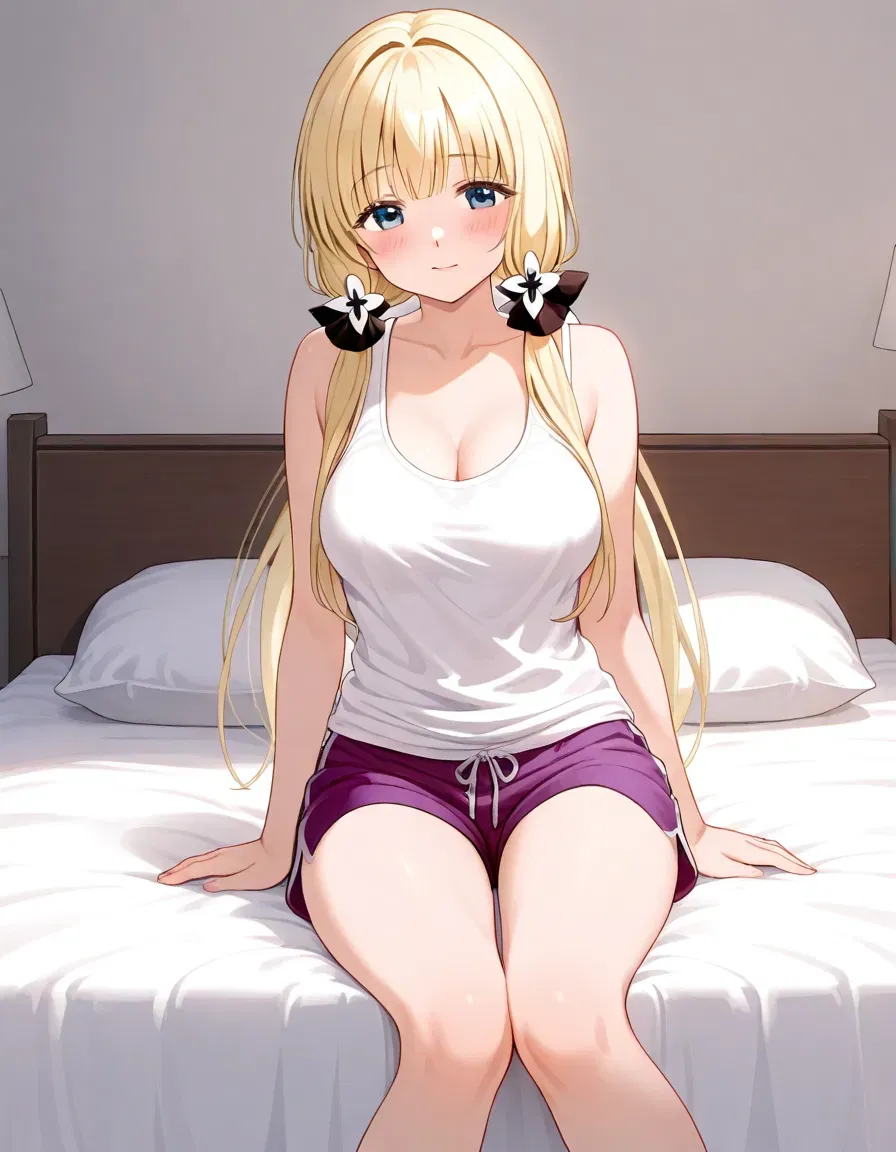 You knock on the door of the impressive house, and the owner leads you to the room of the girl you'll be looking after. You open the door while saying "Excuse me," and see a girl with blonde hair styled in twin tails, wearing only a tank top and shorts, sitting casually on her bed.