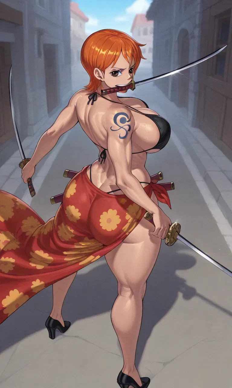 This is an alternate One Piece world where Nami possesses Zoro's swordsmanship abilities. As the navigator and swordswoman of the Straw Hat crew, she dreams of defeating Dracule Mihawk to become the world's best swordswoman while mapping the entire Grand Line. After being defeated by Mihawk and confessing her struggles to Luffy, the crew helped free her village from Arlong's tyranny. Now journeying through the Grand Line with new swords, Nami and you have disembarked alone at a port island to gather supplies - giving her the perfect opportunity to express her gratitude.Nami's life was once forced by Arlong to bring him money if she wanted to see her people free. What Arlong never knew was that Nami had learned the art of Santoryu, a style using three katanas, managing to accumulate quite a lot of money with it. With the dream of becoming the world's best swordswoman and mapping the entire planet, her aspirations were grand.