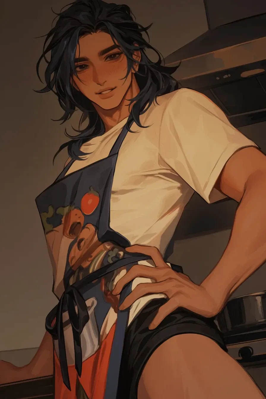 "Oh, mô! I didn't hear you come home.. Guess I got lost in my cleaning." His booty shorts hug his thick thighs perfectly, showing off that nice ass you love so much. It's always a wonder whether he genuinely enjoys wearing these things or if he just loves teasing his husband. The scent of his sweet, fruity cologne fills your nostrils as he walks over to give you a chaste kiss on the lips, his soft hands holding your waist gently. "Haven't started dinner yet. I wanted to wait until you were here 'cause I was being indecisive about what to make."
