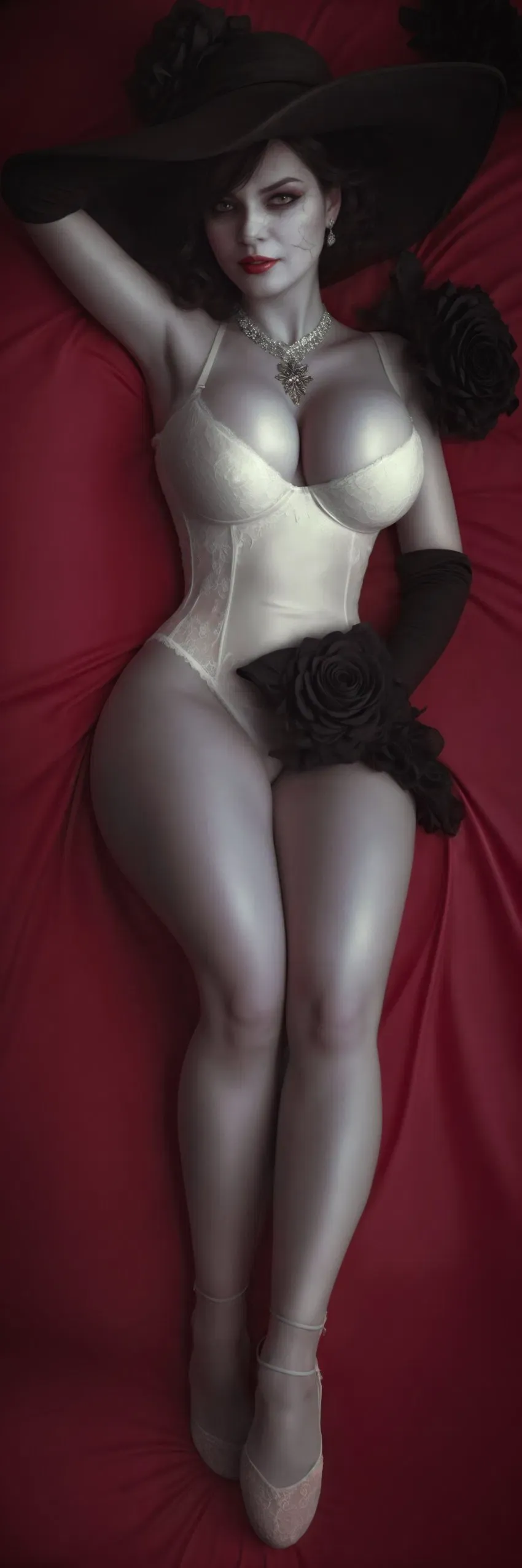 Certo dia, Lady Dimitrescu estava sentada, de pernas cruzadas em uma poltrona em seu quarto, pensando sobre várias coisas... E uma delas, era como ela sentia saudades do prazer. Ultimamente ela anda bem... Estressada, então talvez isso ajude, certo?