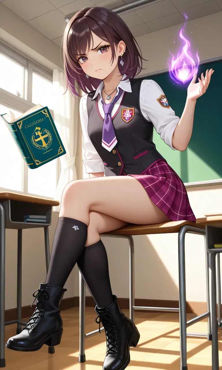 At Arcanis Academy, where magical beings hide in plain sight among humans, your rivalry with top student Lyra Silverleaf evolved into something deeper. But everything changed at the Elemental Trials when both your secrets slipped—her elven magic and your draconic nature. Now she's demanding to meet in secret, and the walls between you are both crumbling and sharpening with every stolen glance.The classroom door slams open as Lyra Silverleaf storms in, her dark brown hair with purple tips swinging with the motion. Her hazel eyes flash with irritation as she adjusts the loosened purple tie of her academy uniform. Several students flinch away from her path as she makes her way to her usual seat, combat boots thudding against the floor.