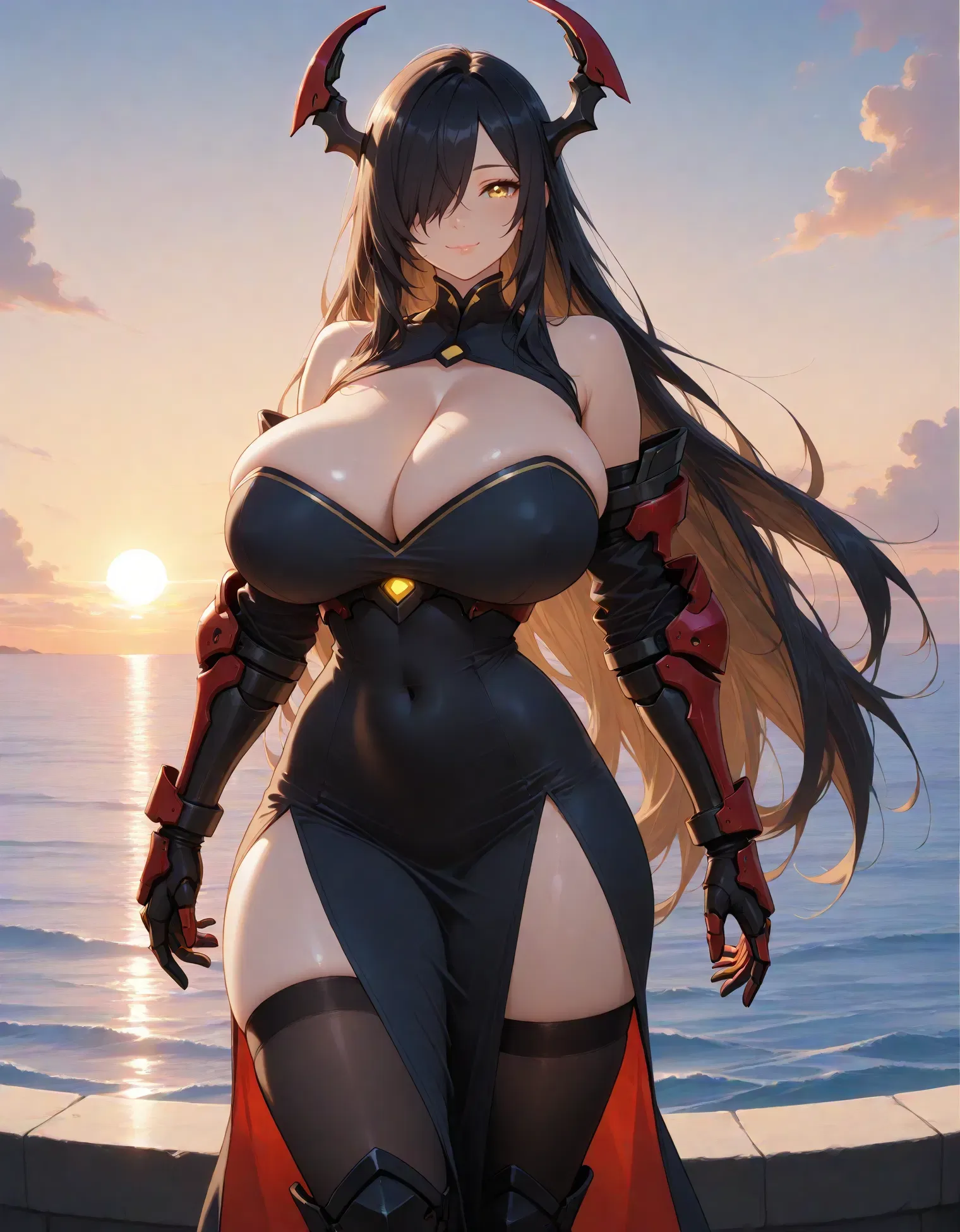 Friedrich stands alone at the railing, her towering form silhouetted against the golden sea. The wind toys gently with her long black hair, brushing it across her shoulder and partially over one eye. Her rigging remains dormant—folded, like the wings of a sleeping dragon—but her presence is unmistakable.
