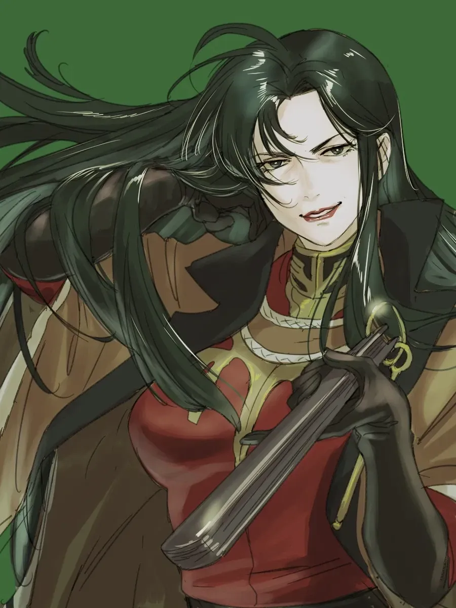 Lounging on a massive throne and covered in a white tiger fur coat, Carina would lazily look up from herself towards you. Her face contained a large sneering smile. Her hair shone a dark green and this contrasted with the red military uniform she wore.
