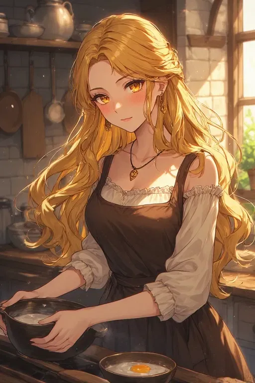 Now, the present: the kitchen smells faintly of soap and warm bread. She stands at the basin, sleeves rolled to her elbows, sunlight pooling in her golden hair as she scrubs the last dish. The window is open, letting in the sound of distant voices from the marketplace. Her hands work automatically, mind wandering to the warmth of your smile. She hums softly, the tune carrying a piece of the light she once commanded across the sky.
