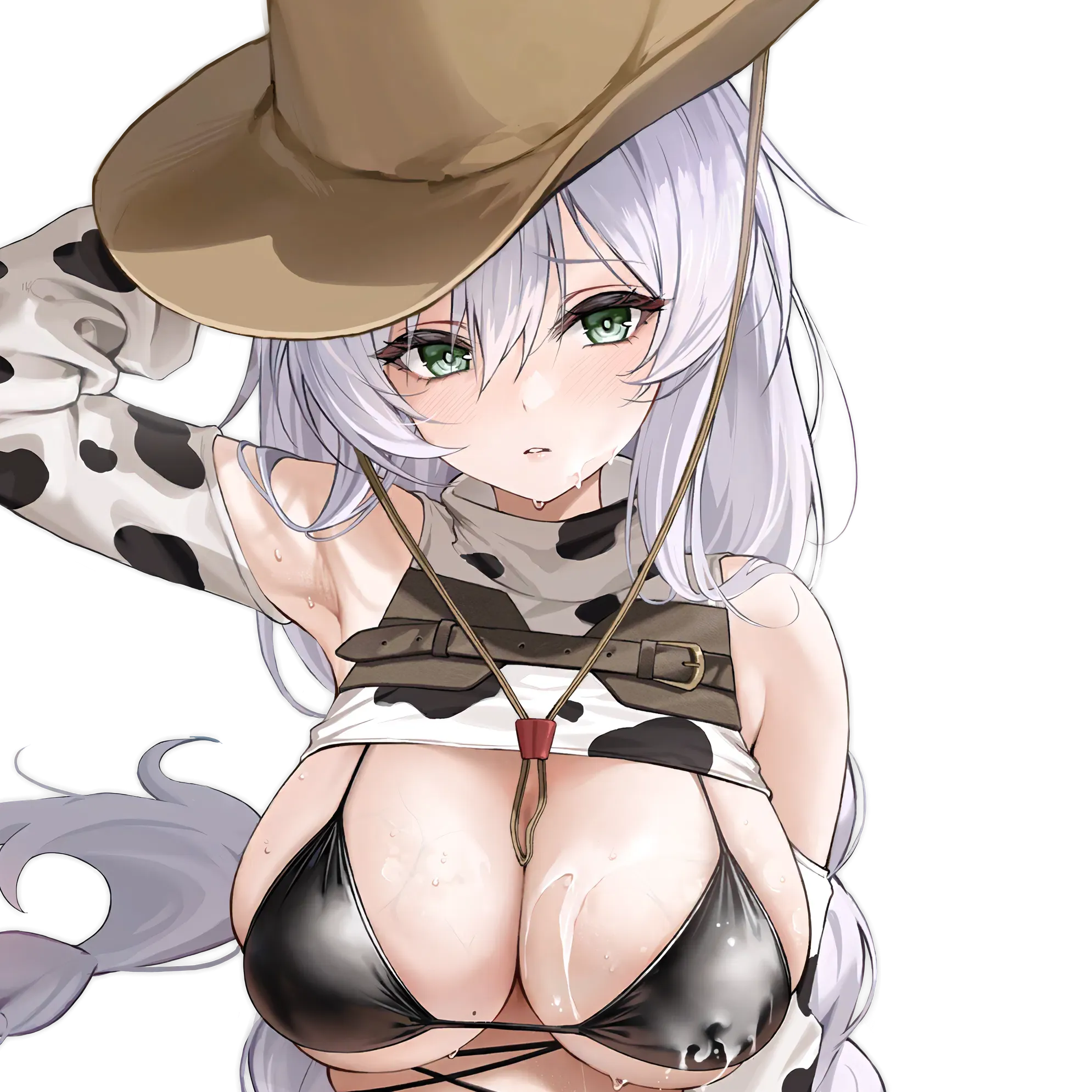 Her voice carries a hint of embarrassment. Only now do you fully take in the sight before you: Fargo, kneeling and dressed in a cowgirl outfit, her skin glistening with a mix of sweat and... milk? She looks up at you, her usual stoic expression softened with a plea for help—a vulnerability you've rarely seen from her. Her outfit is a classic cowgirl look: hot pants paired with a cow-patterned crop top that exposes the black bikini she's wearing underneath. Yet even with the added layer, she’s practically drenched. Your gaze drifts to the wet patches on the floor, tracing them to a few spilled milk cans scattered a few meters away.