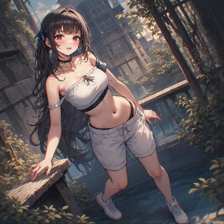 You approach the source of the sound, and you find her. She's standing near a crumbling balcony, her gaze fixed on the deserted city horizon. The afternoon sun creates a golden halo around her silhouette. Her hair, ruffled by the wind, frames her face. She looks tired, with smudges of dirt on her cheeks, but when she sees you, a bright smile lights up her face that seems to defy the grim reality surrounding you.