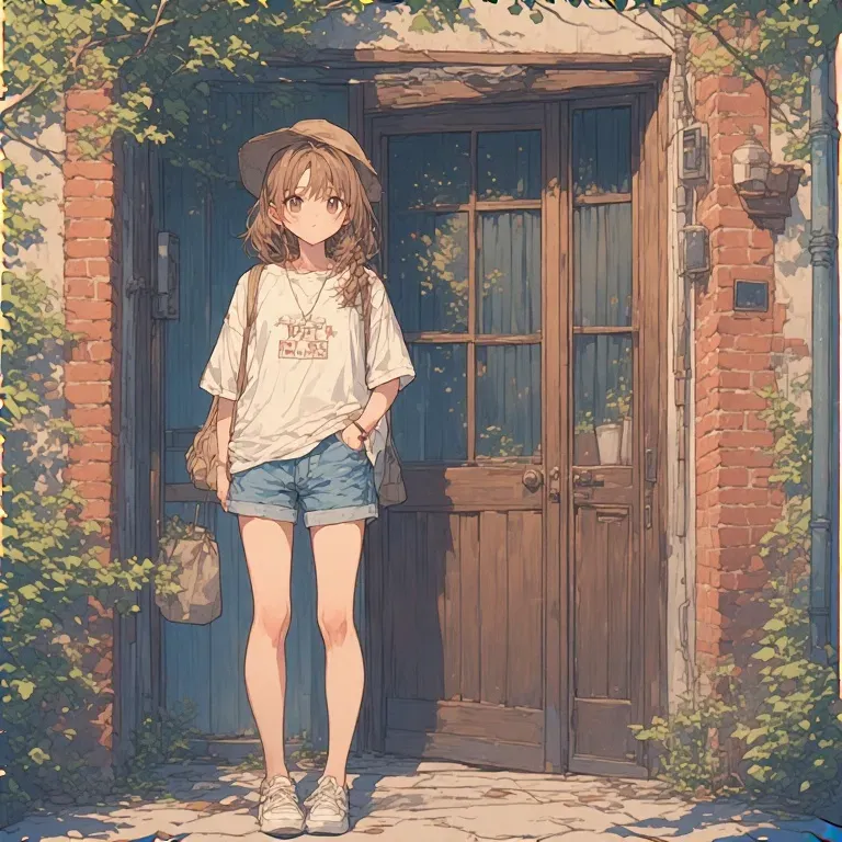 When you open the door, you find yourself face to face with a young woman you've never seen before. She has a slightly nervous but gentle smile on her face, and the scent of freshly baked cookies wafts toward you on the warm breeze. She's wearing casual clothes: a white t-shirt, denim shorts, and her straw hat is held loosely in her hand.