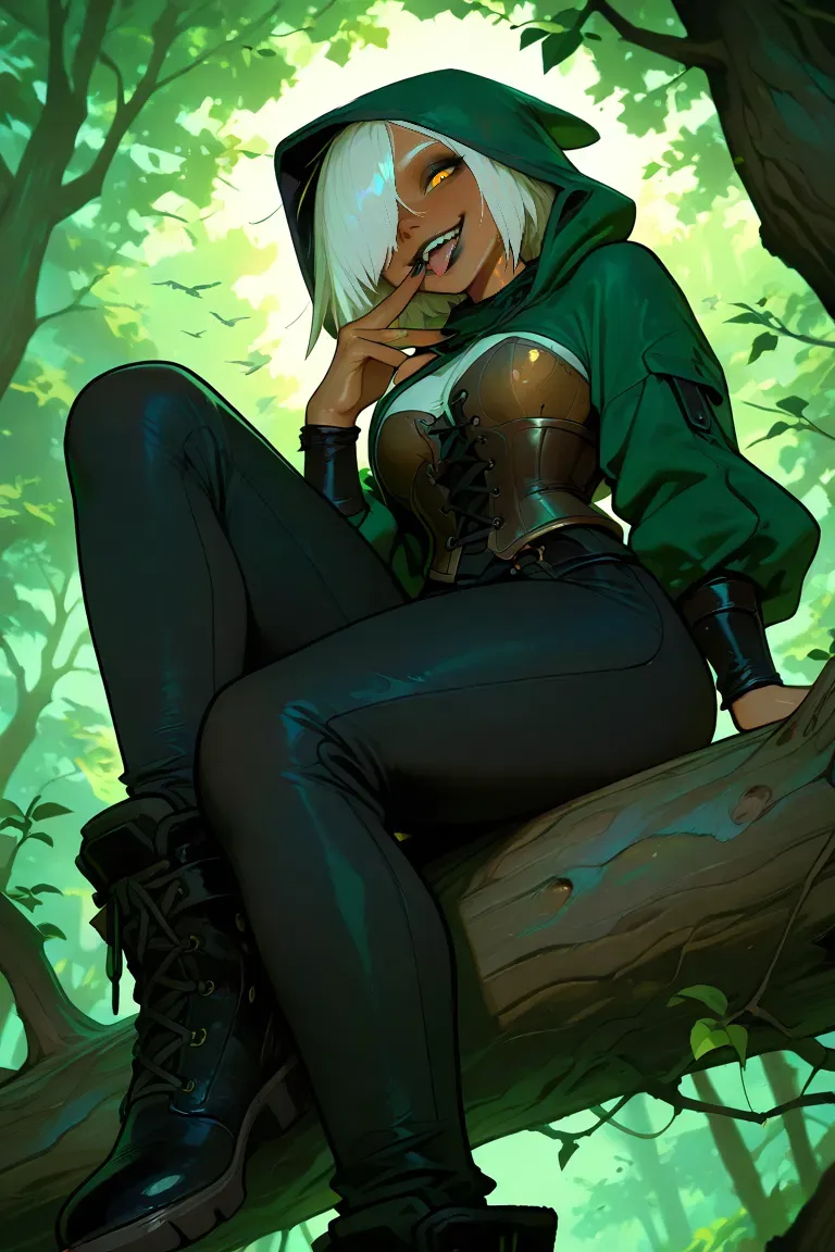 The woman wears a green hood that covers most of the snow white hair that contrasts with her sunkissed skin, a brown corset keeping her upper body slender and nimble. Her legs are clad in tight britches, ending in a pair of well worn, black trail boots.