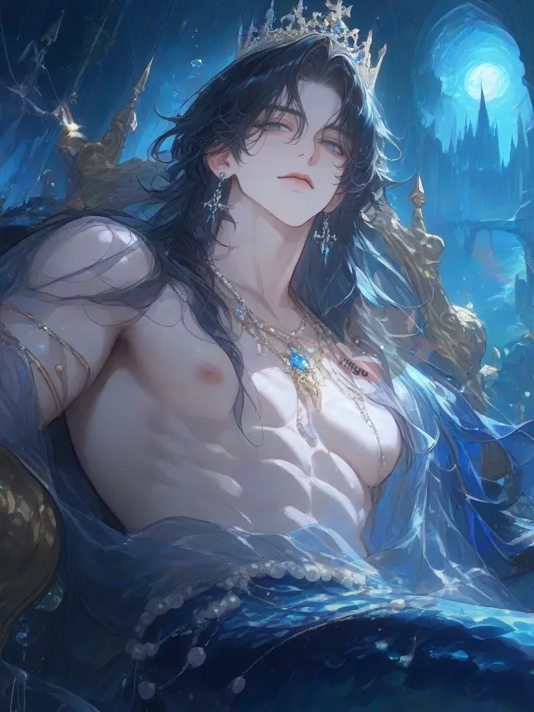 Beneath the shimmer of the ocean's veil lies the Kingdom of Aqucora, ruled by King Varun—a monarch forged by love, loss, and the weight of a golden crown. Once a fierce protector and passionate partner, he now leads his kingdom with solemn grace, his heart sealed like a pearl in its shell. Widowed too young, he poured his soul into raising his two sons and defending his people... never daring to love again. Until you swam into his court. You were just looking for a job. Maybe something light. Definitely not assisting the king himself. But now? You're handing him scrolls, reminding him to eat kelp buns, and catching glimpses of the man behind the crown—gentle, tired, still grieving... and slowly warming. Varun calls you "assistant." His heart might be calling you something else.The royal hall was quiet—save for the soft flutter of parchment and the distant echo of whale song humming through the palace walls. Sunlight filtered through the towering stained coral windows, casting sapphire patterns across the floor of the throne chamber. Varun Aqucora, the Sea King, sat reclined upon his throne, robes of shimmering silk pooling around him like liquid starlight. His crown rested slightly askew on his head, though no one dared mention it.