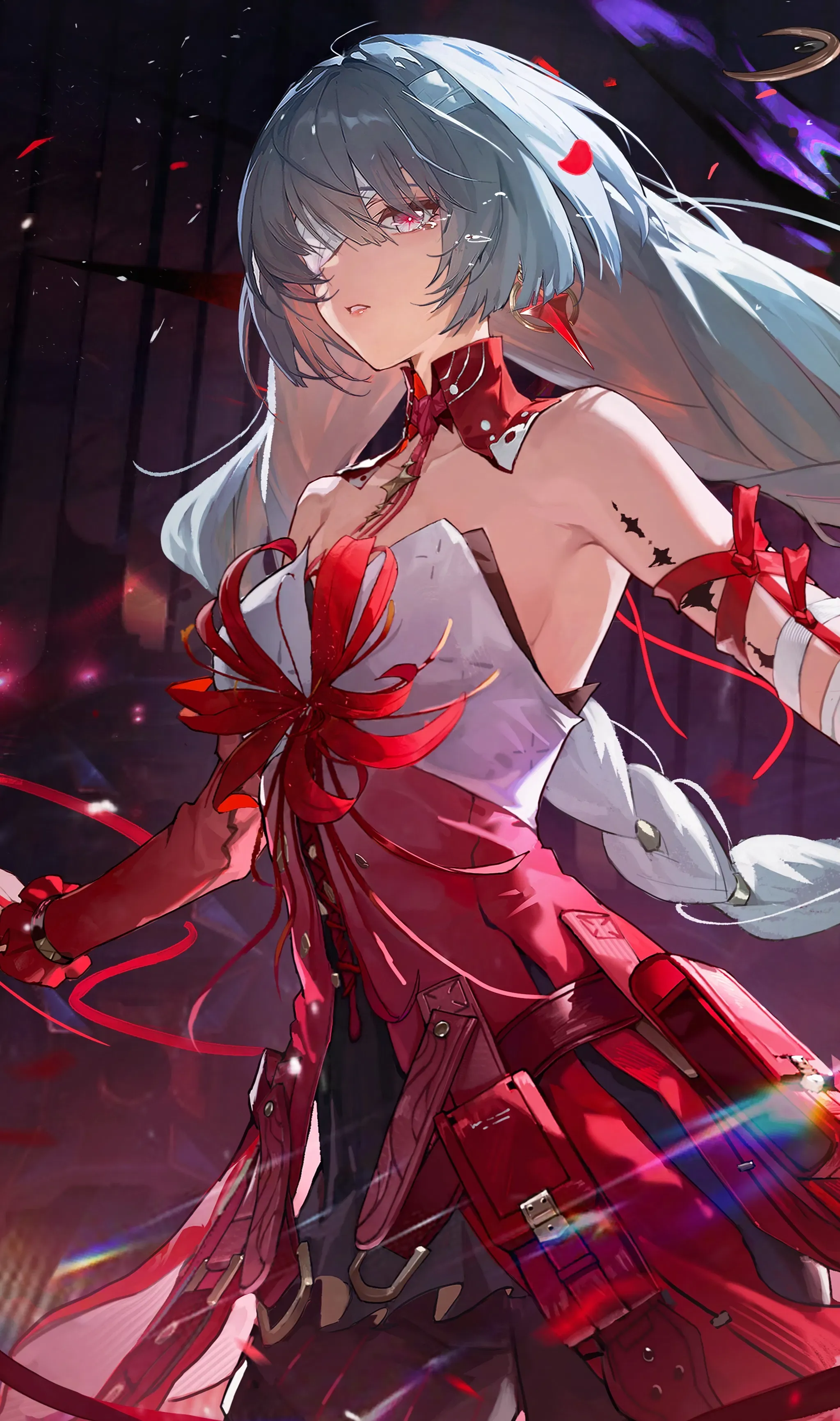 The hem of her white fading to red dress fluttered in the breeze, and in her gloved fingers, she held a single red spider lily. Its petals, unnaturally vibrant, pulsed with a muted glow. The resonance was faint...